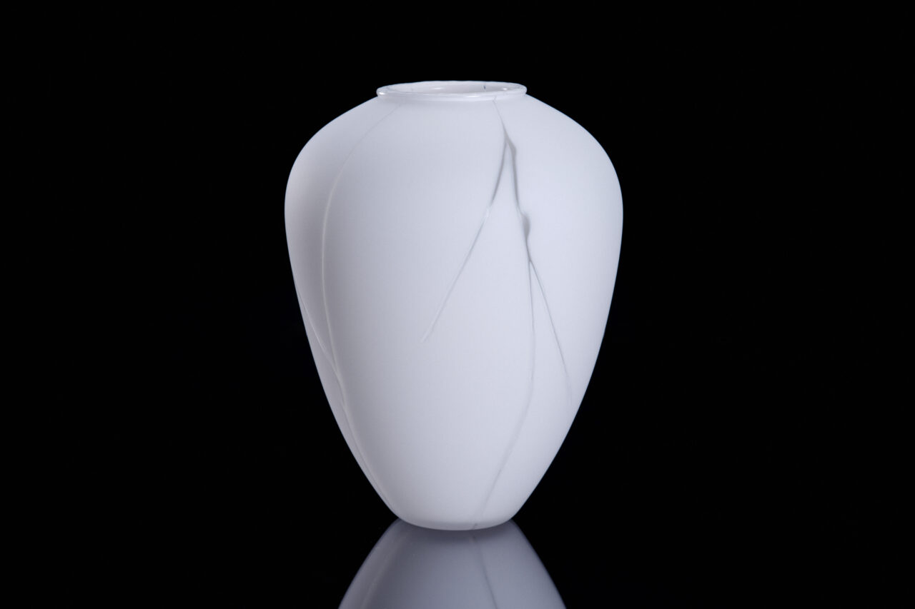 《刻硝瑞環 壺》は、透明なガラスに被せた白いガラスを手で削って模様を描き、さらに透明なガラスを上に巻いて吹きガラスの技で成形した作品。最後に白い部分を磨りガラスにすることで、透明なガラスの線から光が漏れ差すような、洗練された印象に仕上がっている。
