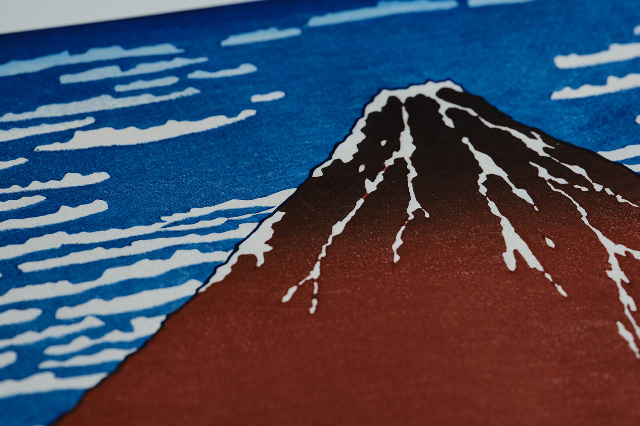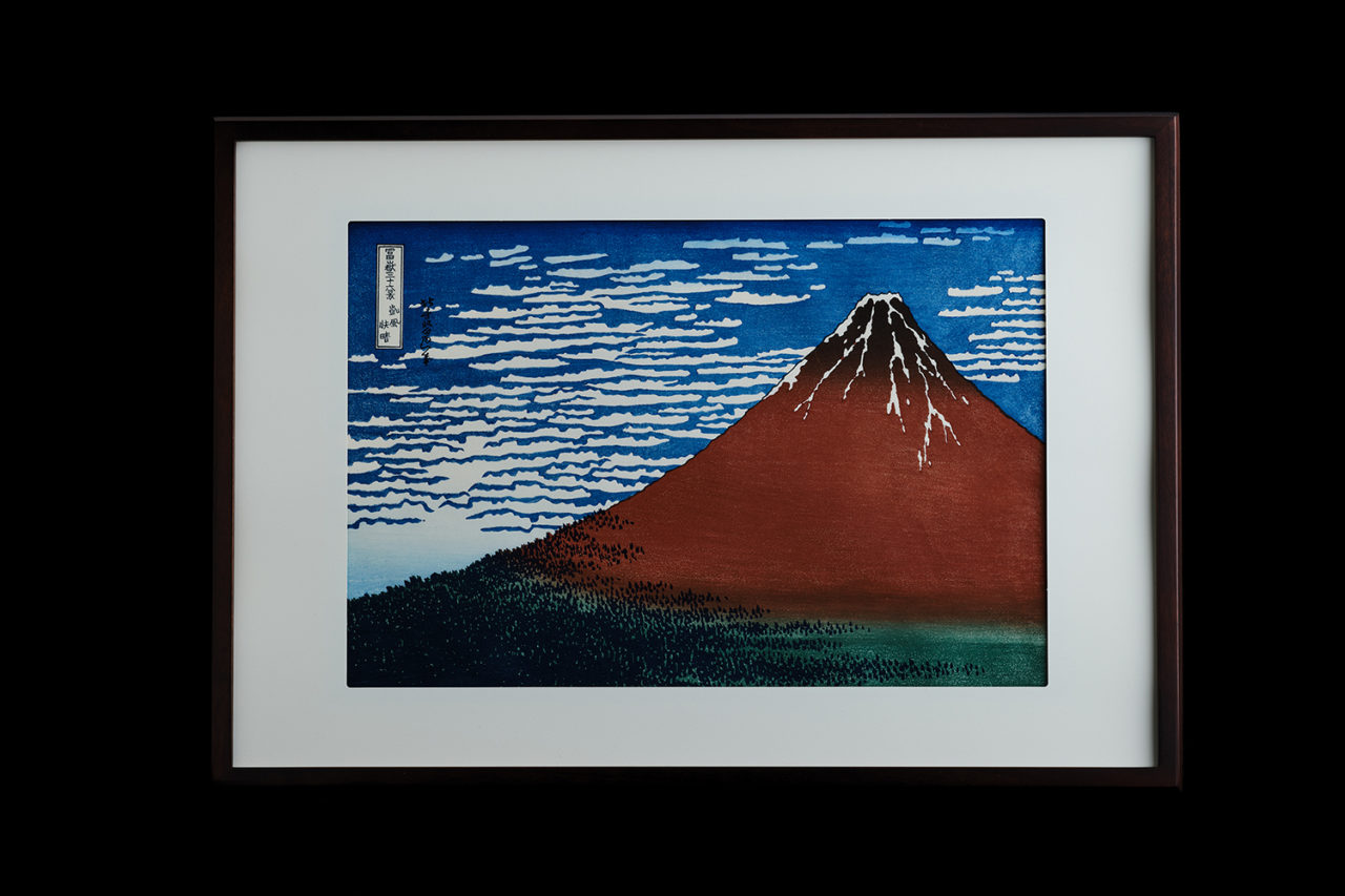 富嶽三十六景 凱風快晴 諸工芸 メーカー 高橋工房 産地 東京 サイズ Frame: 510mm x 350mm x 20mm / Print: 250mm x 380mm 素材 和紙(越前生漉奉書紙) 時を超える赤富士 江戸時代から変わらぬ技法で摺師が何度も色を重ね、柔らかな和紙に写しとった鮮やかな色調の江戸木版画。葛飾北斎の代表作である朝陽を浴び赤く染まる雄大な富士の姿は、職人の手により受け継がれ、いつの時代も変わらぬ感銘を与えてくれる。 SHARE WITH