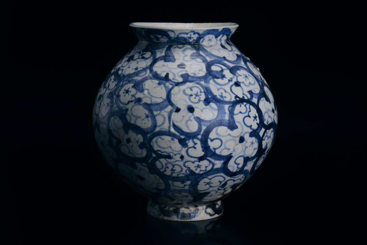 李氏朝鮮時代の韓国で作られた「月壺」と呼ばれる白磁壺。満月を思わせるその造形に着想を得ながら、染付の小花の文様を一面に描いたこの作品は、どこか古物のような懐かしさを湛えながらも、現代的で軽やかな愛らしさを持っている。正面の文様が大きくはっきりと浮かび上がる一方で、裏面の文様は幾重にも重なり合い、にじみや揺らぎが繊細なリズムを生み出している。白と藍の濃淡が呼応する姿をゆっくりと視線でなぞることで、ひとつの壺の中に異なる表情を見て取ることができる。空間に詩的な余白を与える一品だ。