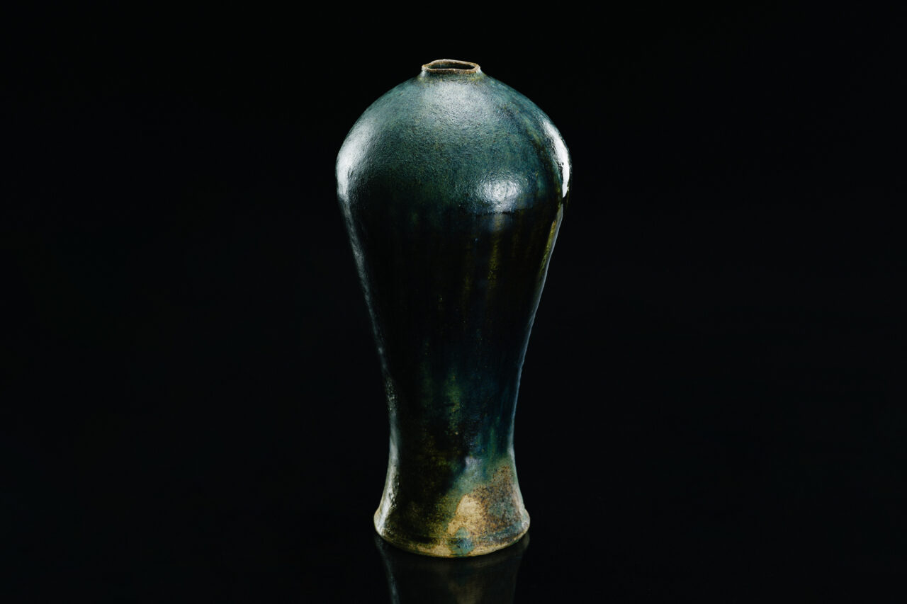 加藤氏は自身の作陶においてとりわけ茶碗の制作に重きを置いているが、花入にもまた、見逃せない優品が少なからず存在する。本作はその一つであり、気品ある姿には洗練された魅力が宿る。肩は柔らかい丸みを帯び、胴は流れるような直線に象られ、全体が豊かな織部の色彩に包まれている。そこに在るだけで凛とした美を湛えながら、花を引き立てるスマートさも見て取れ、作品としての完成度は非常に高いものだと言えるだろう。