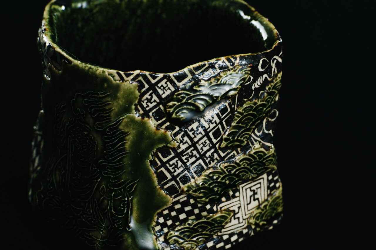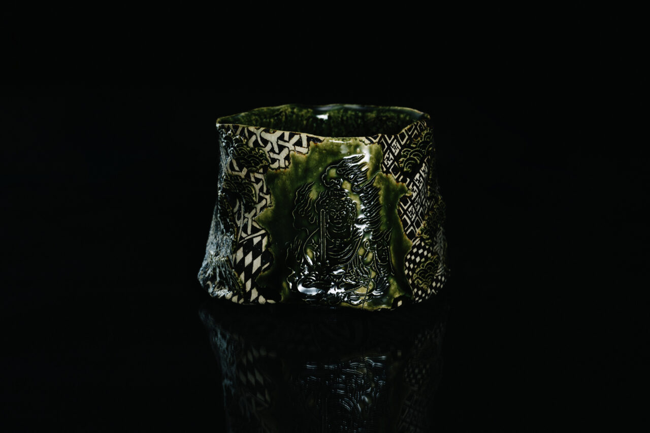 《織部不動明王図茶碗》は、山口氏の代名詞ともいえる、独自に編み出した琳派織部作品の一つだ。鉄絵で描いた市松や亀甲などの紋様を隙間なく敷き詰め、石膏で型をとった不動明王と青海波を貼り付けている。貼り付けた箇所には織部釉が施され、緑の濃淡の中に絵が浮かび上がって見える仕掛けだ。非常に手の込んだ手法で作られており、360度、高台際まで一切の妥協が見られない。