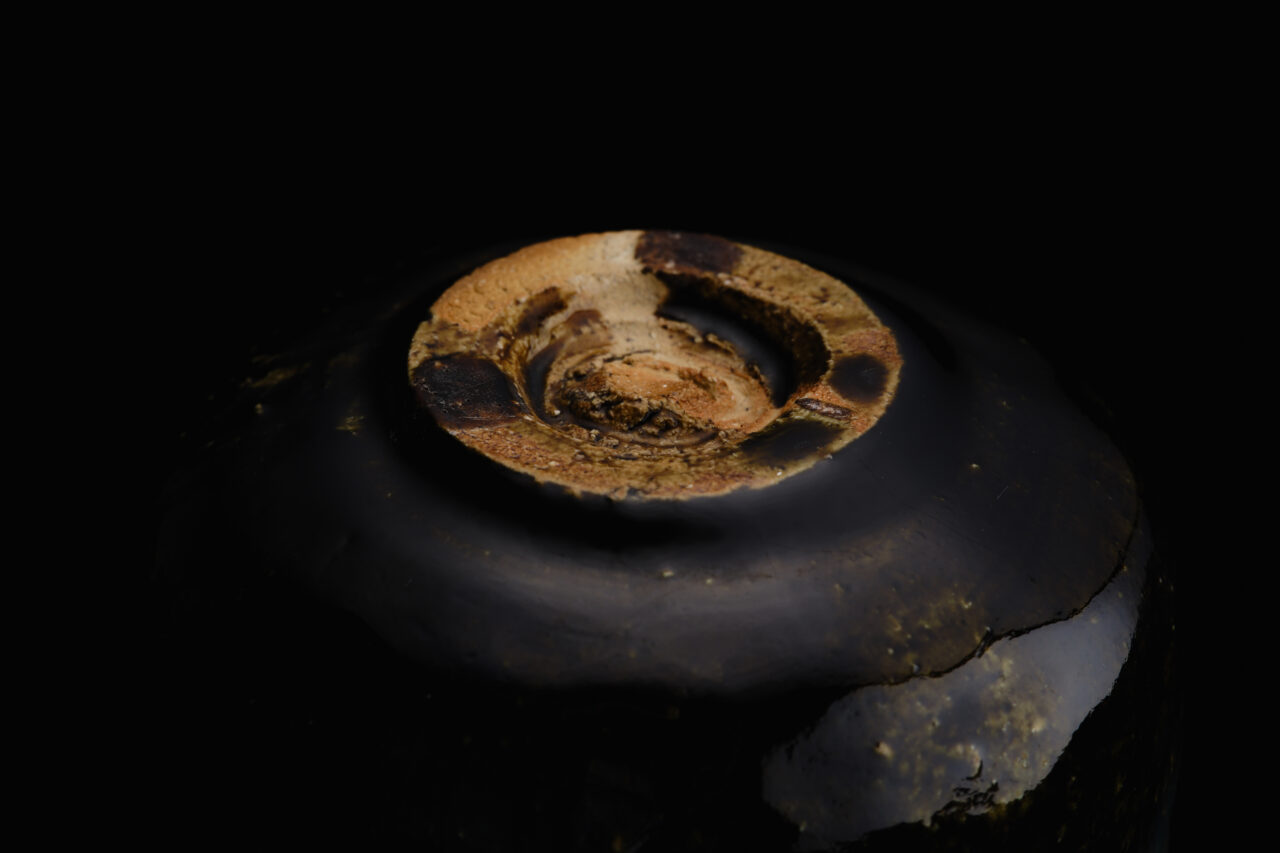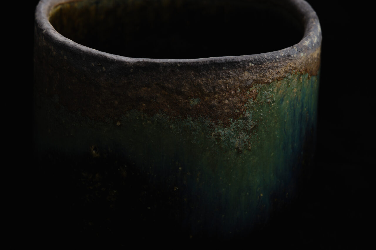 陶芸家、加藤亮太郎氏の織部茶碗の魅力は、何と言っても穴窯で何日もかけて焼成されていることだろう。明るい緑から深い青へと流れる緑釉の窯変、窯の中で掛かった灰が焦げて黒くなった口縁、釉薬の下から垣間見える白い土。一つの茶碗の中に現れる様々な景色は、日本の変化に富む自然を眺めるようである。焼き物の半分は自然の力によるもの、と真っ向から火と向き合う作家の気迫が伝わってくる。