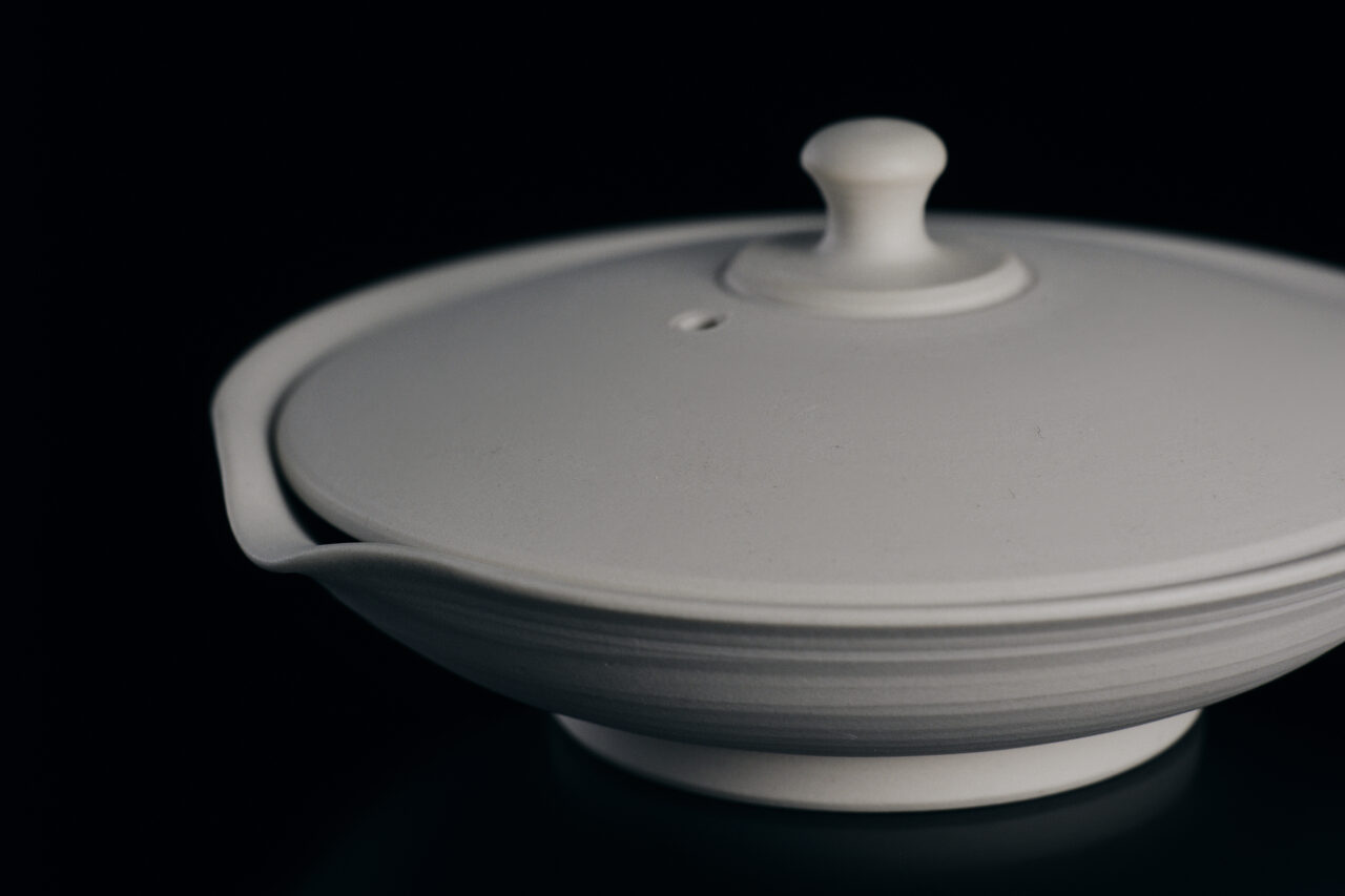 そうして生まれた本作《絞り出し 白土焼き締め》は、白土のしっとりとした質感と柔らかな白、そして彼のろくろの技術が生む機能的で洗練された意匠が調和した作品である。絞り出しはいわゆる取っ手の無い急須で、日本茶の味や香りを引き出すのに最適な茶器。現代の暮らしに溶け込む佇まいの中に、凛とした美しさを見て取ることができる。実際にお茶を淹れてみれば、白に緑が映えて、また新たな美を発見することができるだろう。