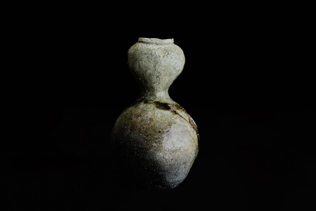 陶芸一家に生まれた澤克典氏は、信楽焼の他、織部や個性的な絵付けも得意とし、独自の作風を築いている。本作品は、焼成中に窯から引き出し急冷させることで現れる美しい景色が見所。信楽ならではの粗さが残る土味や、自然釉による透き通るような青緑の色合い、絶妙に入った焦げ。作品が持つ豊かな表情はどの角度から見ても味わい深く、瓢箪の優美な形状をさらに引き立たせている。