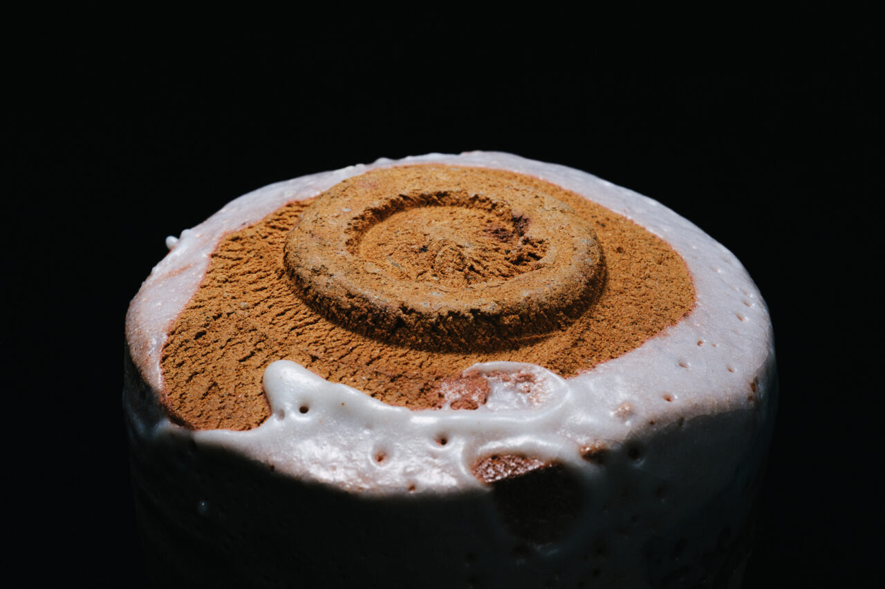 素材の持ち味を引き出し、自然の力強さを感じさせる氏の作品には、一瞬で人の心を掴む、際立つ個性が備わっている。茶碗全体を柔らかく覆う釉薬を透かし、目に飛び込んでくる大胆な鉄絵。裾に流れて溜まった釉には、緋色に色付いた指跡がくっきりと残っている。内を覗くと、ほんのりと茜色に染まった白釉の美しい景色が広がり、焦げた赤色や柚子肌の大小の孔、きめ細かな貫入が目に楽しい。