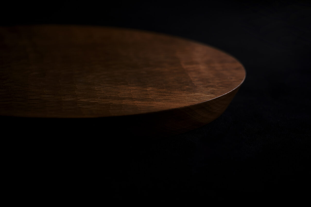 鍛木皿 さみだれ 漆芸 メーカー 駒井漆器 産地 富山県・高岡 サイズ Φ240 × H20 mm 素材 栃、漆 五月雨の跡 鍛木皿と名付けられた木の器は、高岡漆器の伝統技法の一つ、彫刻塗に着想を得て生み出された。挽物職人がろくろと鉋で仕上げた樹齢百年の栃の木に、鍛金職人が力を込めて刻む繊細な槌目。さらに生漆が塗り重ねられると、雨跡のような陰影が木目の上に浮かび上がって見える。漆芸と金工で知られる工芸のまち、高岡で職人技の連携によって作られる美しい品は、端正な佇まいの中に手仕事のぬくもりを宿している。 SHARE WITH