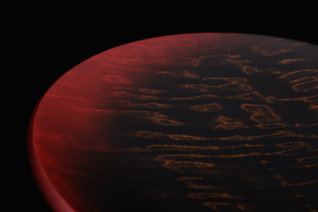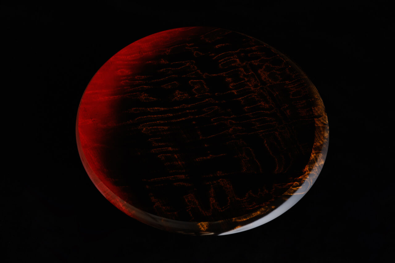 三日月のように削られた口縁が光る本作は、幾多の工程を経て生み出されている。柔軟性や杢目など、それぞれ異なる木の特徴に目を配りながら、その木に最適な形をろくろで削り出す。さらに赤と黒の漆を塗っては研いでを繰り返し、丹念に艶やかな模様を引き出していく。宵の空にたなびく雲のような杢、そこにかかる月のような美しい風情は、木の個性と向き合う作家の情熱の賜物だ。
