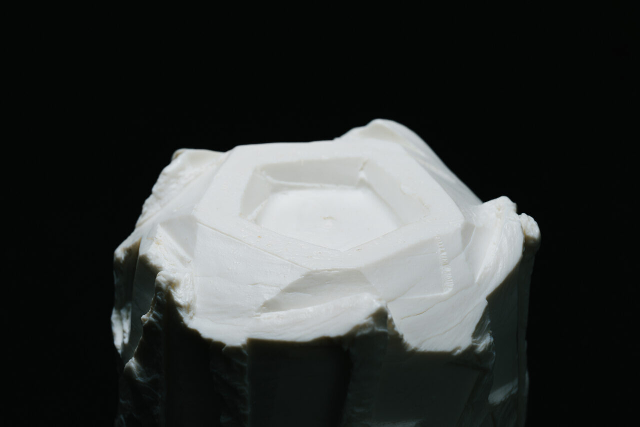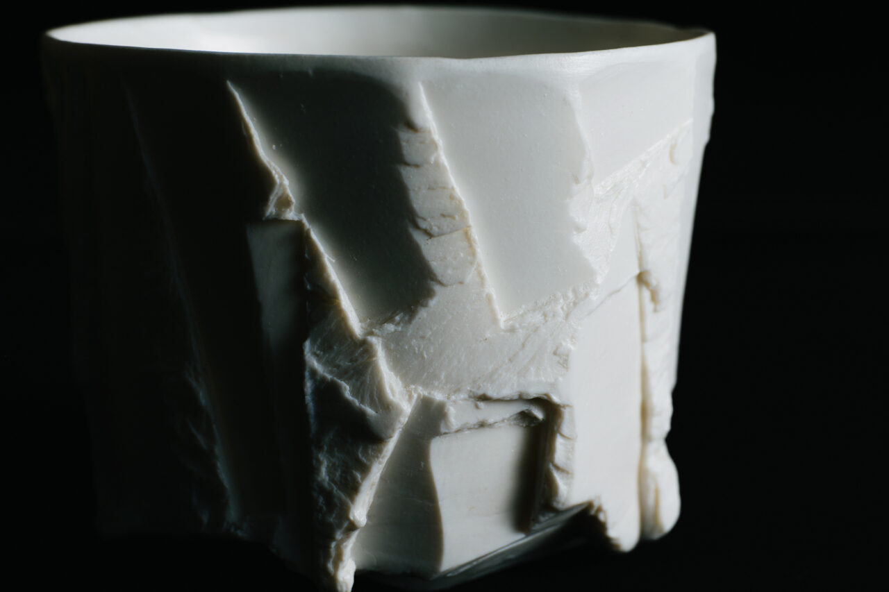 炎による多様な窯変が見どころの備前焼だが、白備前も江戸時代から作られていたことがわかっている。現存する古い作品は希少かつ、現代の作品も作家により白の風合いはさまざまだ。藤田氏は、備前市三石の地下深くから採掘された純度の高い陶石のみを薪窯で無釉で焼き締め、ほかに類を見ない白く眩い景色を作り出した。切り立つ雪の山脈のように鋭く削り取られた形状は、白い土の潔い魅力を一層高めている。