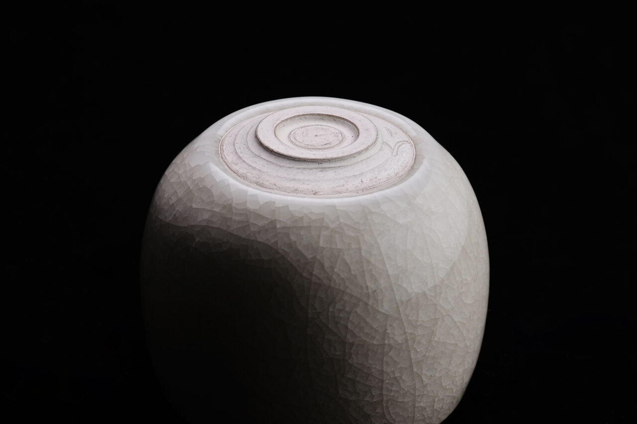 細かな貫入が幾重にも広がり、雪の結晶のように煌めく様は、一面の銀世界が光を受けて輝くよう。重なり合う白い襞が奥深さを生み出し、その景色はいつまでも見飽きることがない。