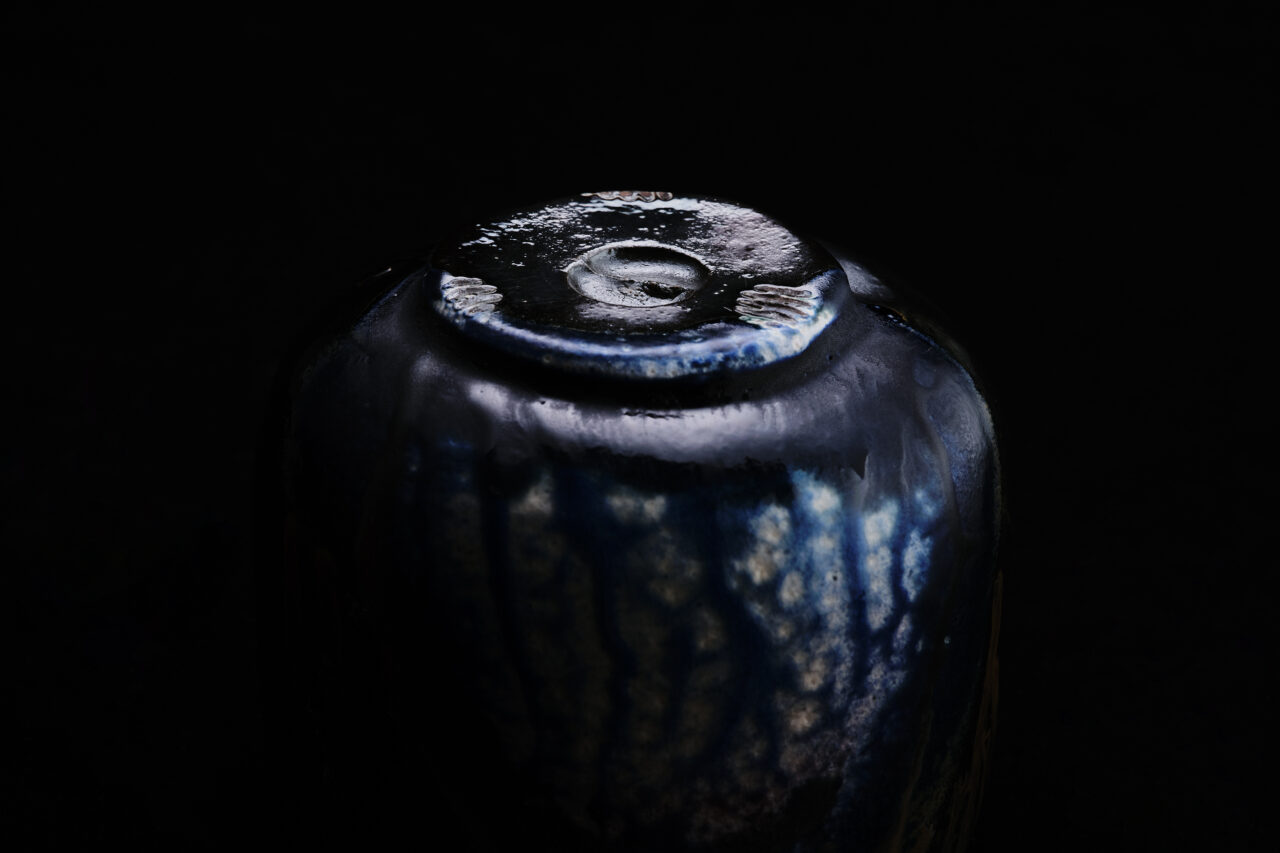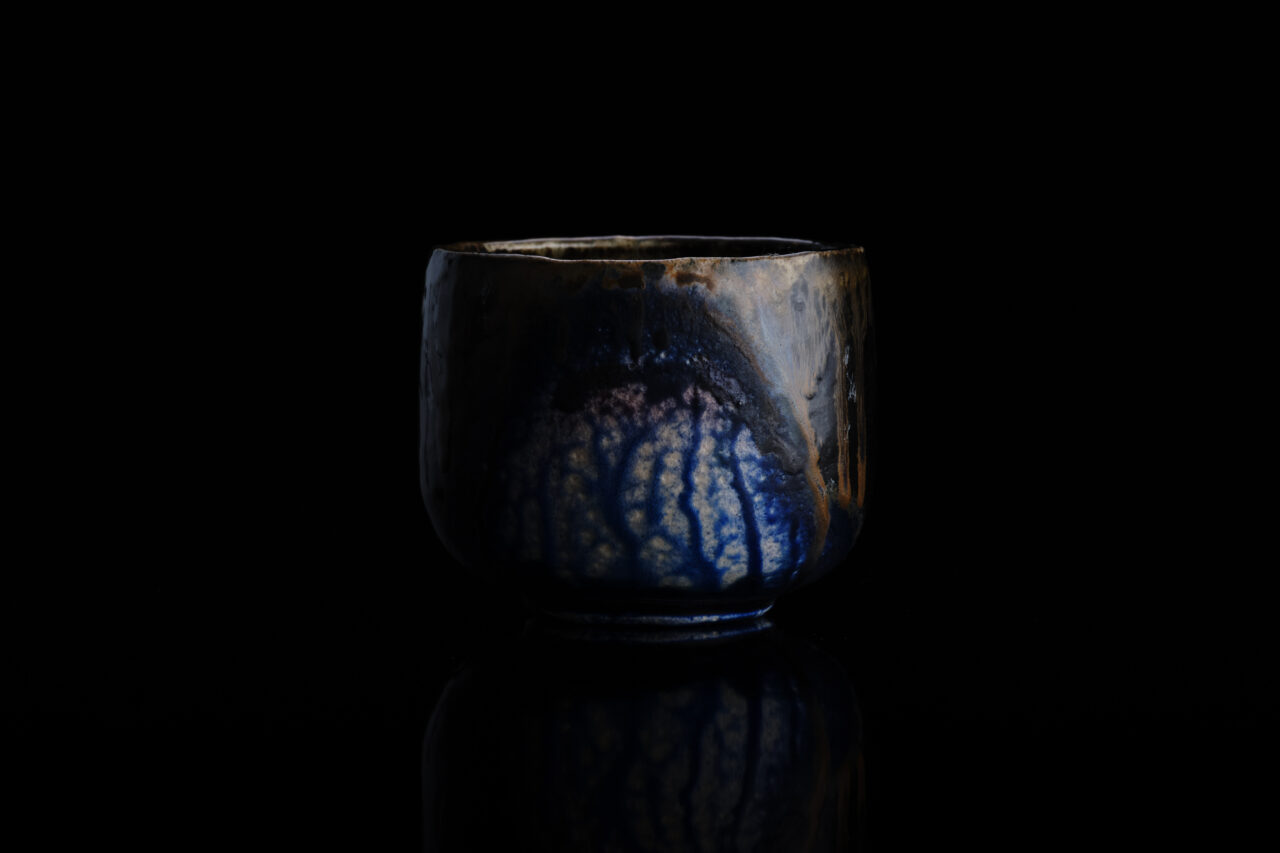 その備前で自身の陶芸の道を歩む作家、馬場隆志の茶碗は、一目で氏の作品とわかる個性を放ち、凄みさえ感じさせる。口縁から流れる漆黒の艶は、伊部手という塗り土を施す備前の伝統技法を研究したどり着いた表現。高台から立ち上る鮮烈な青い筋は独自の土の調合から生まれた。登窯の中で起こる窯変は予測がつかないものだが、土にこだわり、炎と対峙する作家のあくなき挑戦が、無釉とは思えぬ色鮮やかな作品を作り出している。