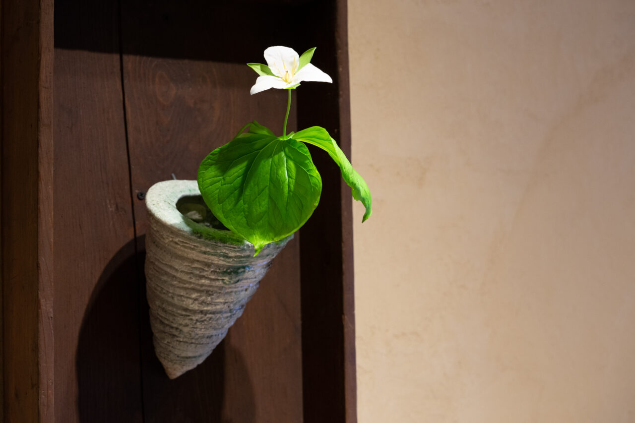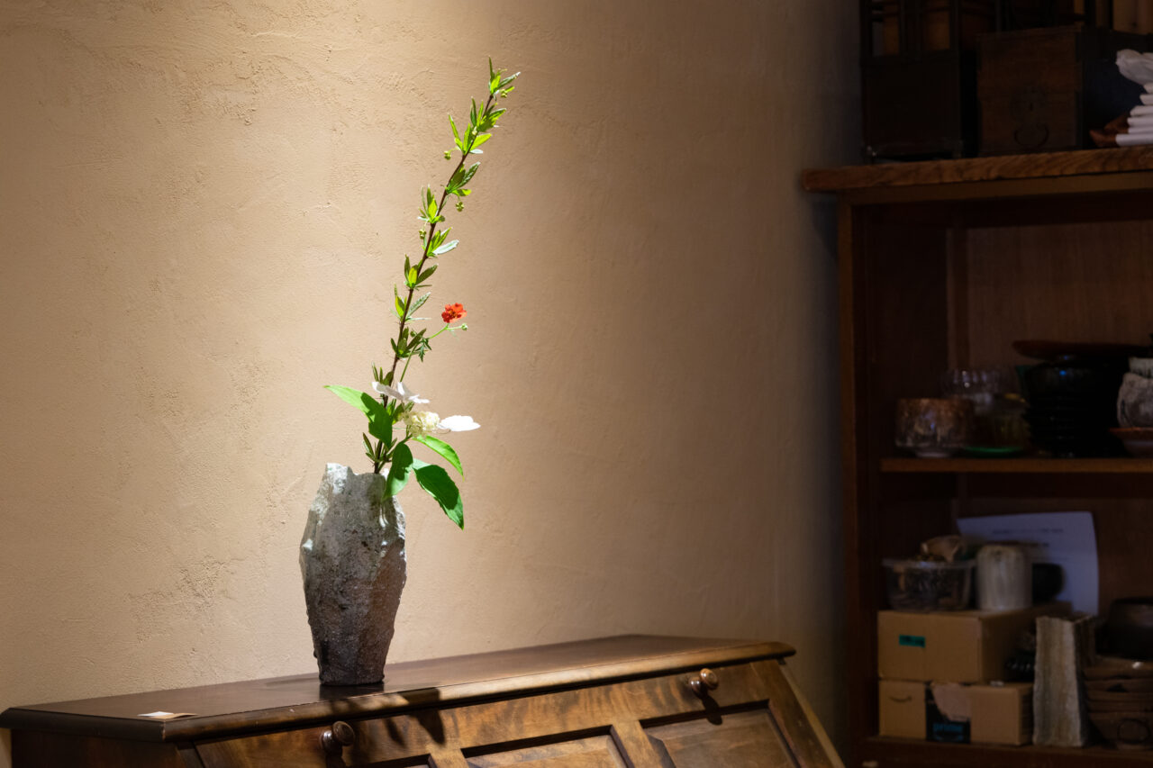 信楽焼は、釉をかけず、土を成形して焼くのみのシンプルな制作過程ですが、土、造形、焼きの違いから、驚くほど多彩な作品が生まれます。今回も、自然釉の美しい茶碗、どこか愛嬌のある表情の狛犬、信楽の象徴的な色である緋色の食器、個性的な形の花入などが勢揃い。花入に品良く生けられた花々は、澤さん自ら信楽の山で採取してきたものです。作品と花が、見事に互いの美しさを引き立て合っていました。