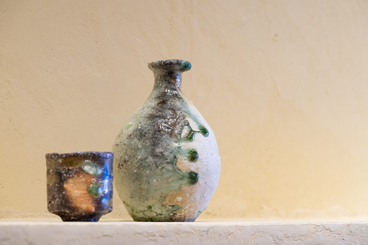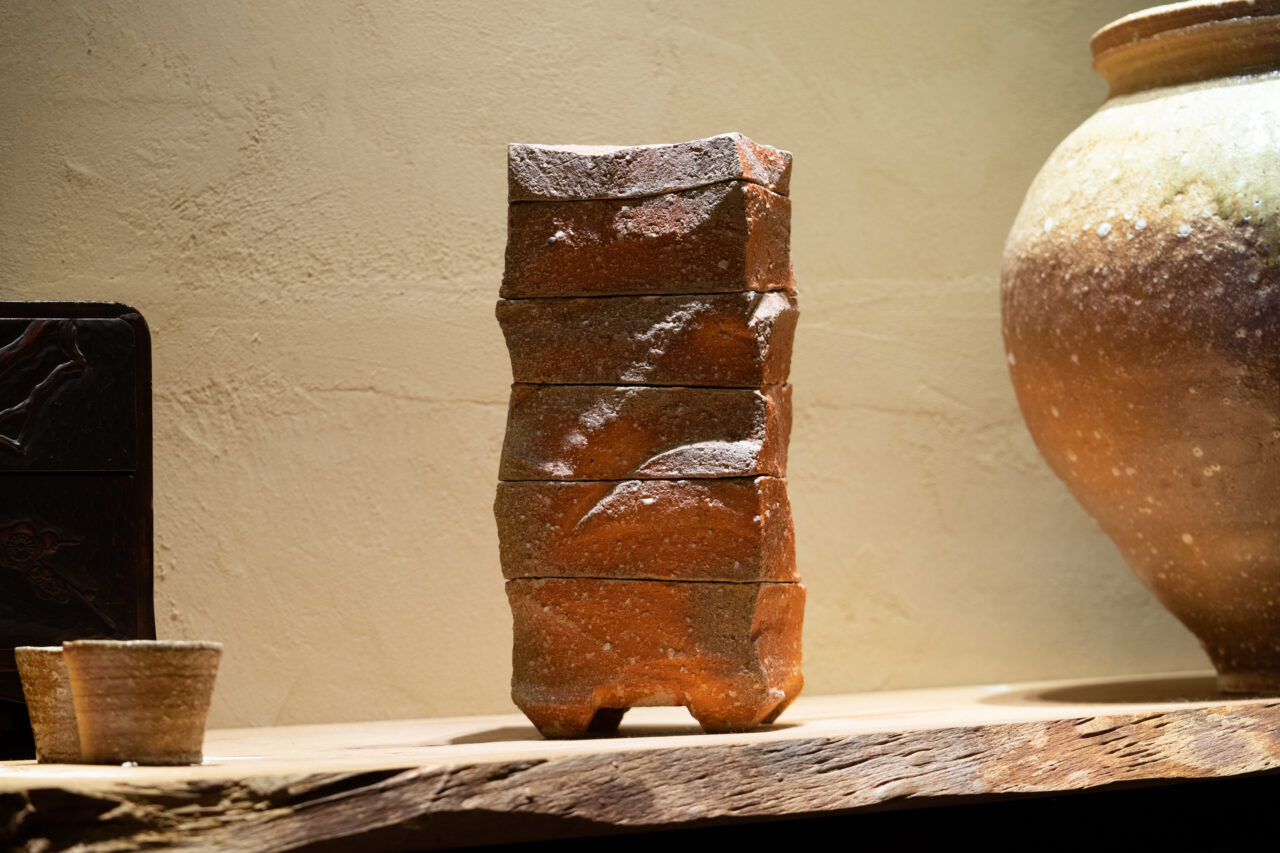 澤さんの手掛ける作品の特徴の一つに、バリエーションの豊かさが挙げられます。土と炎の力強さが伝わる信楽、個性豊かで遊び心のある絵付けが楽しい織部。そのほか志野や引出黒など、その手から生み出される作品は多種多様な魅力を備えています。その中でも、今回は「信楽」の作品に特化した展覧会です。薪窯を焚くこと4日、完成した作品がずらりと並び、圧巻の迫力で迎えてくれました。