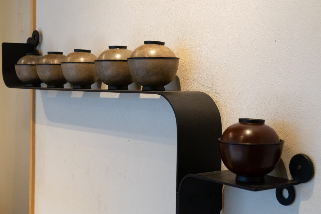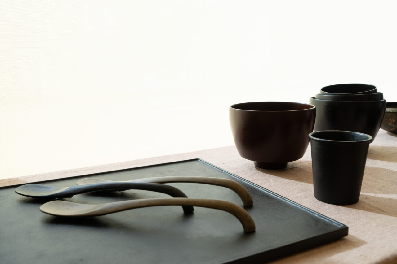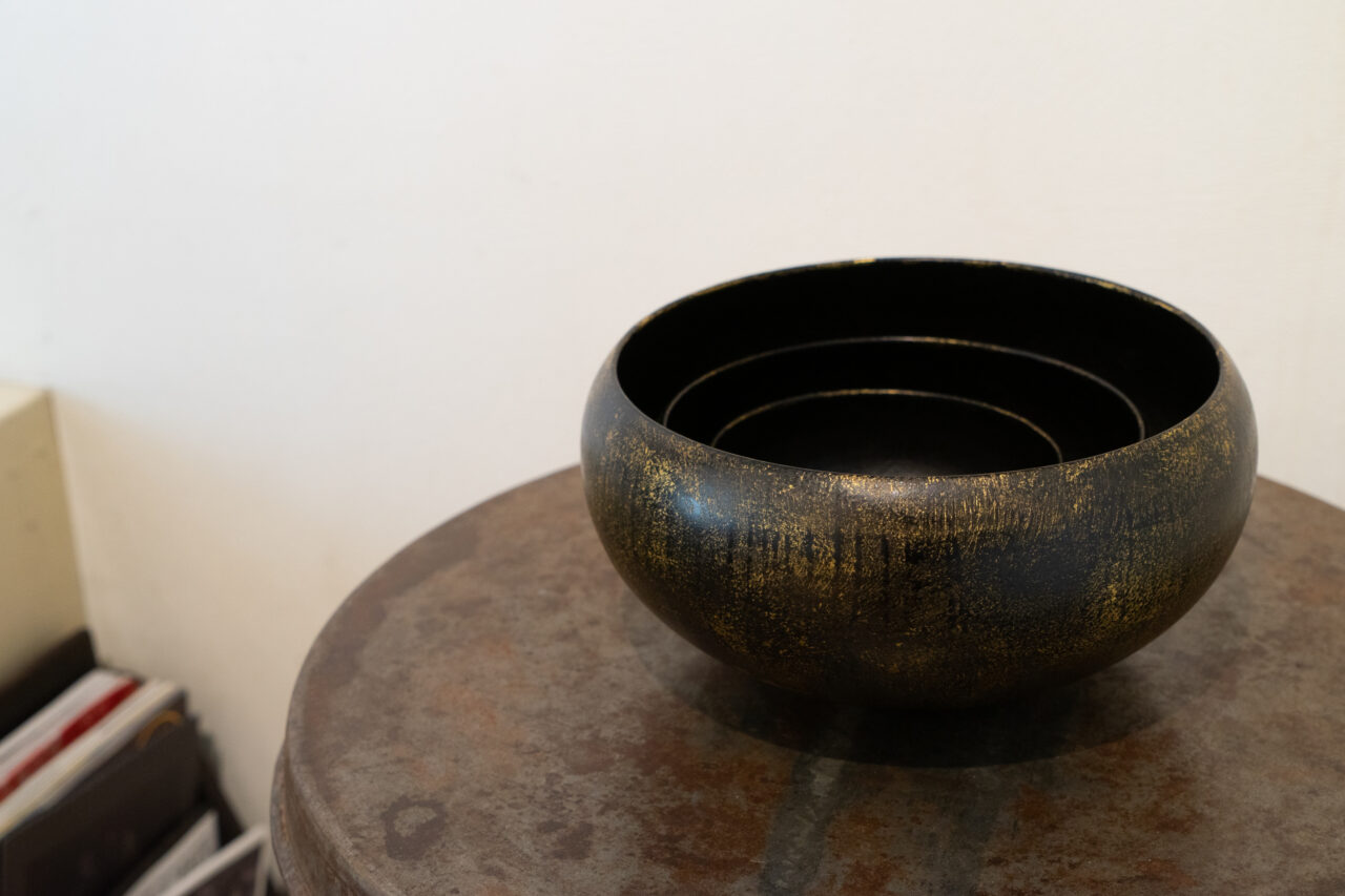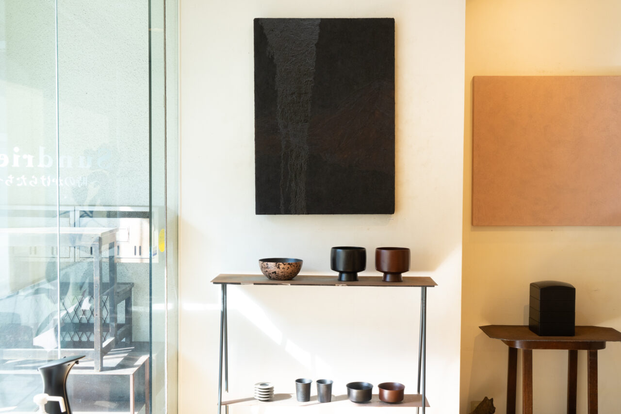 もともと骨董品が好きだという杉田さんの作品は、古物のような落ち着いた色合いと質感が特徴です。昔から日本人の生活とともにある漆器ですが、杉田さんの器は現代のライフスタイルにもしっくりと馴染む柔軟さを持ち合わせています。日常を重ねる中で味わいを増していくものに対する作家の思いが、作品に深みを与えているからでしょう。老若男女を問わず、時代を問わず、人々に愛されていくものの片鱗を、その奥行きある佇まいの中に見出せたように感じます。一方で、壁に展示されていた平面作品に見られるのは、抽象絵画のような新鮮で芸術的な表現。木に乾漆の麻布を掛け、その上から漆を塗ることで、麻布の編み目やしわが模様となり独特の風合いが生まれます。基盤となっている木材は、蕎麦打ちなどに使用されていた大きな古いまな板だそうです。「側面から見るとわかるのですが、足がついているので展示した時に壁から浮かせられる。これが好きで、古いまな板を集めて作品の素材に使用しています」。古きを慈しみ新しきを作る杉田さんの作品の魅力の源泉は、もしかするとその唯一無二の着眼点と、自らの好きなものを突き詰めていく素直な感性にあるのかもしれません。