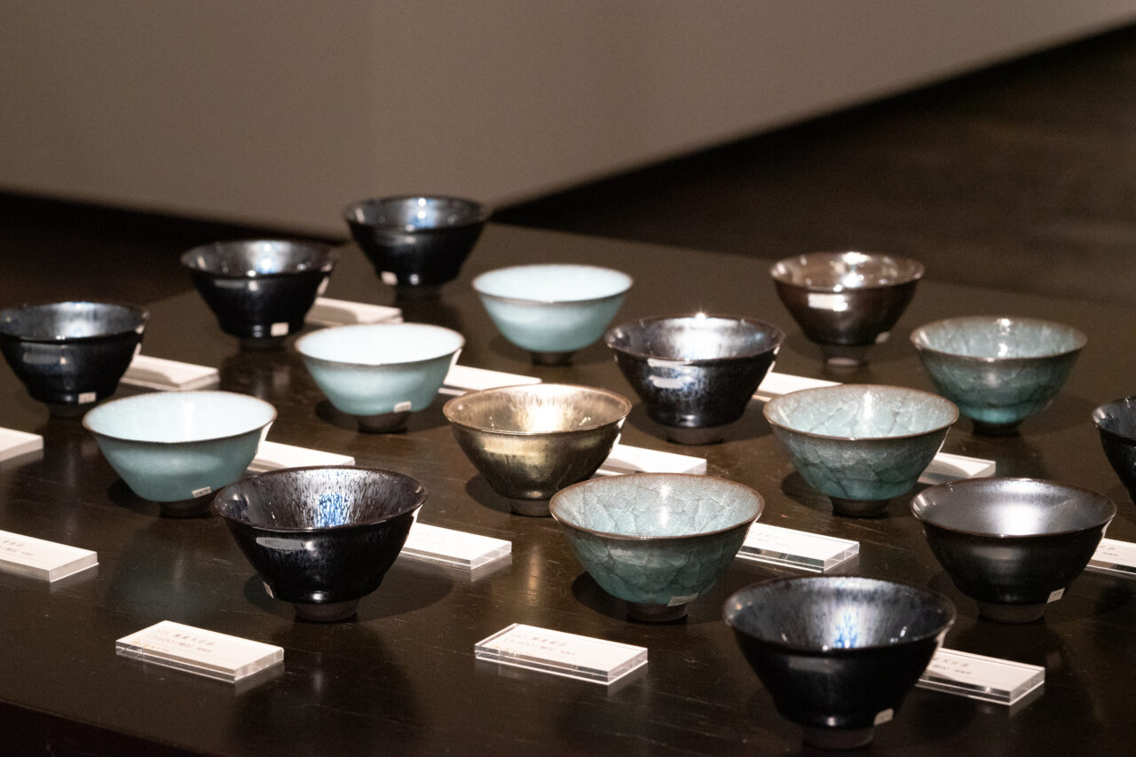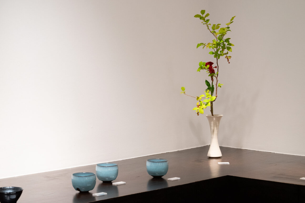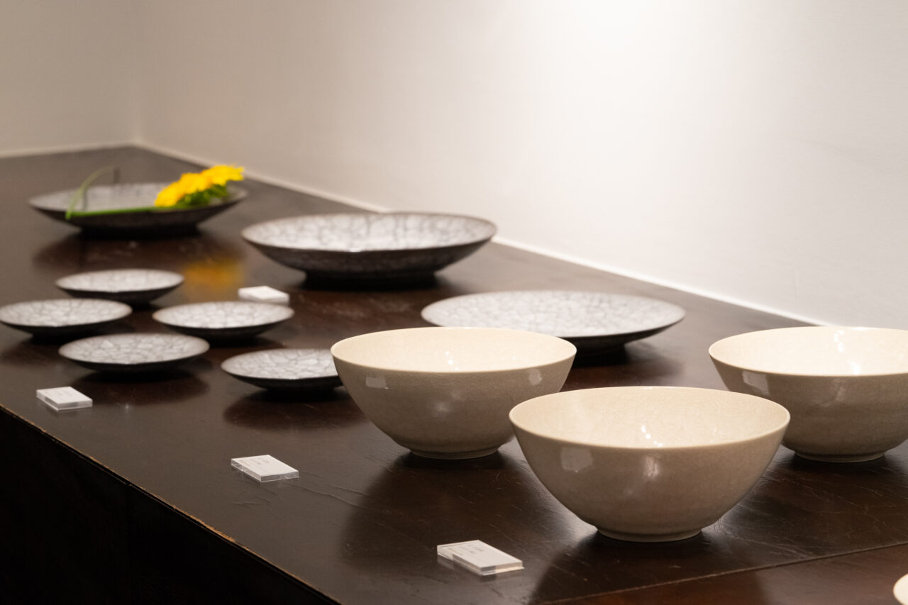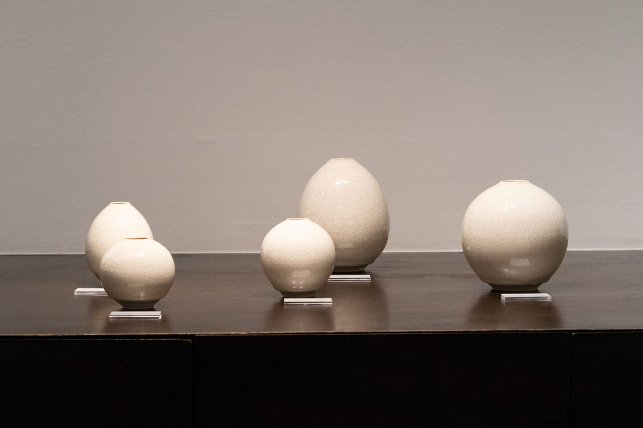 これは青瓷も然りで、作品を手に取りゆっくりと鑑賞していると、深みのある青から明るい青、透明度の高い青、濁った青など、様々な青の世界が広がっていることがわかる。白瓷の作品については、「気軽に使っていただきたい」と今泉さん。上品でありながら普段使いしやすいぐい呑や皿、鉢などのほか、丸い形の可愛らしい花入は女性客にも好評のようだ。釉薬だけでなく形姿にも真摯に向き合い、「今回は丸い形を多く作ってみました」とのこと。茶碗にも丸みのある形が多く用いられており、釉際のバランスの良さや手取りの良さが印象的だった。
