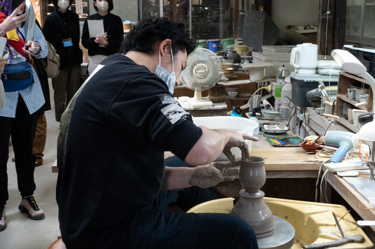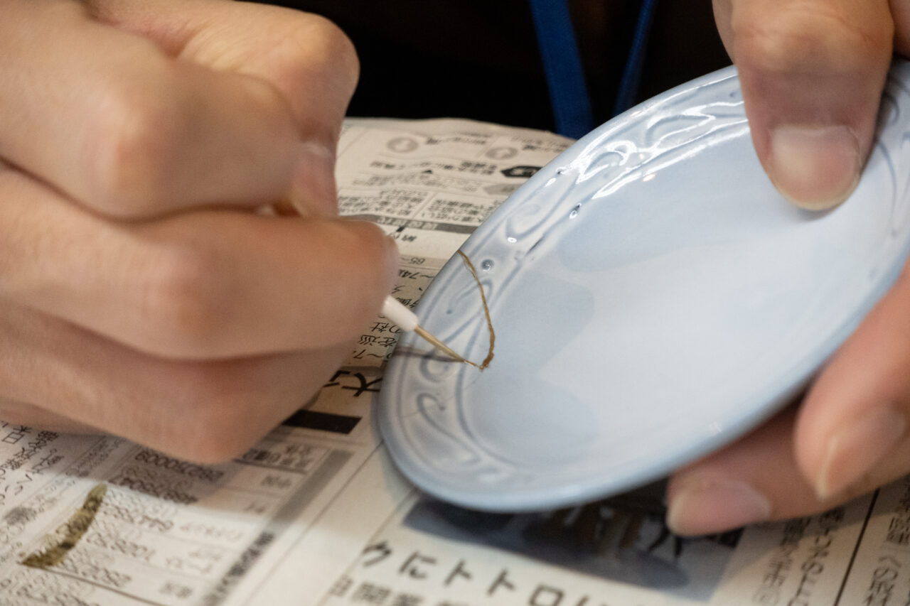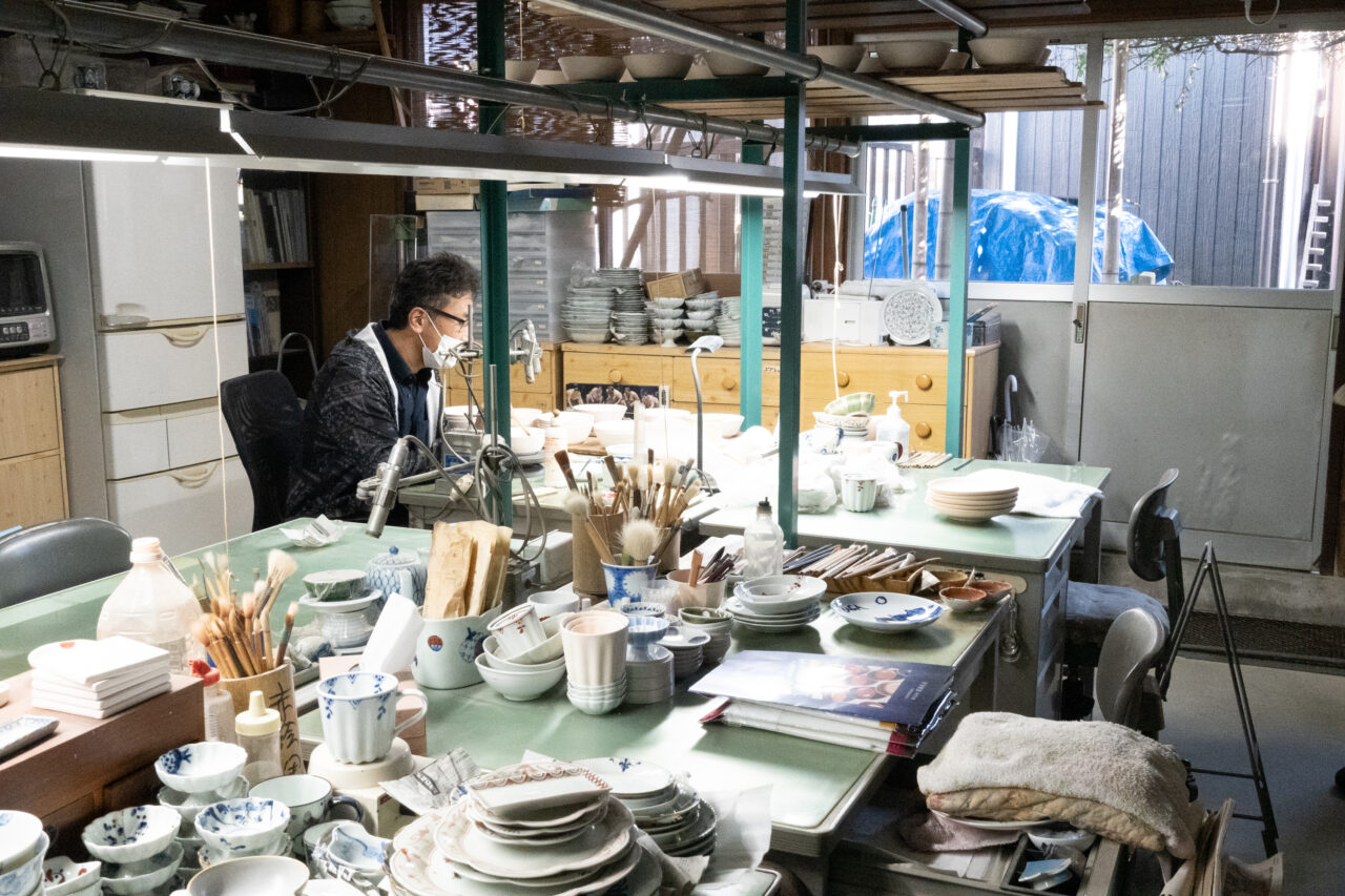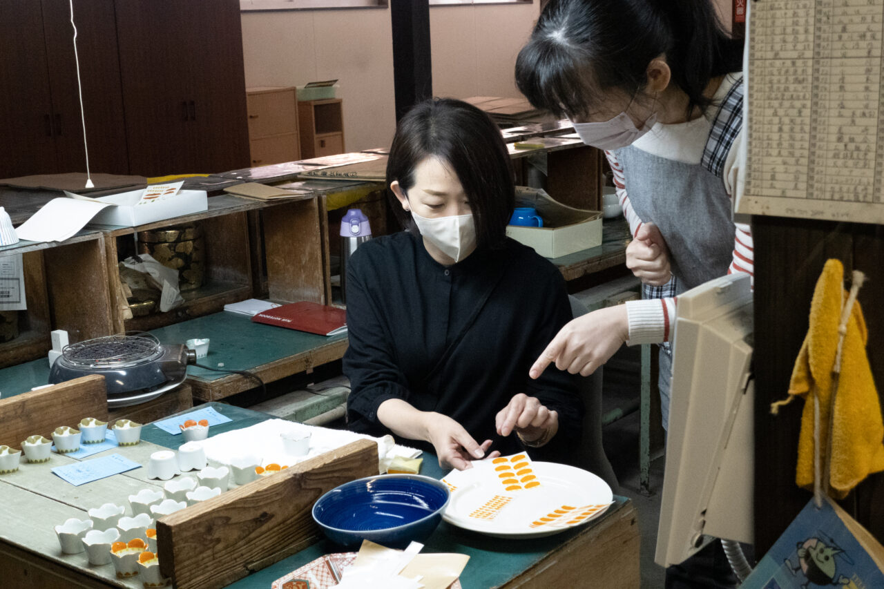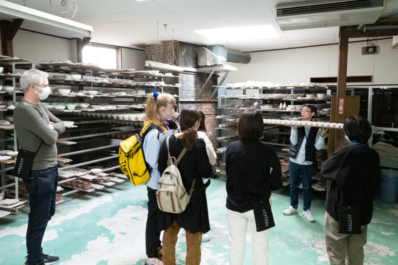 オープンファクトリーもみどころ満載だ。イベント2日目を担当した皓洋窯は家族経営の小規模な窯元で、手描きの染付を中心とした、一般家庭向けの商品づくりを得意とする。呉須の濃度は「勘で調整している」というベテランの絵付け職人の言葉に、参加者からは感嘆の声が上がった。ガス窯にはちょうど2日前に焼いた商品が入っていて、参加者は窯出しを体験することもできた。当主の前田洋介さんは、有田のものづくりに携わる生地屋や道具屋などの各業者の数が減少している問題に触れながら、「さまざまな人に支えられてこの仕事ができている」と語った。