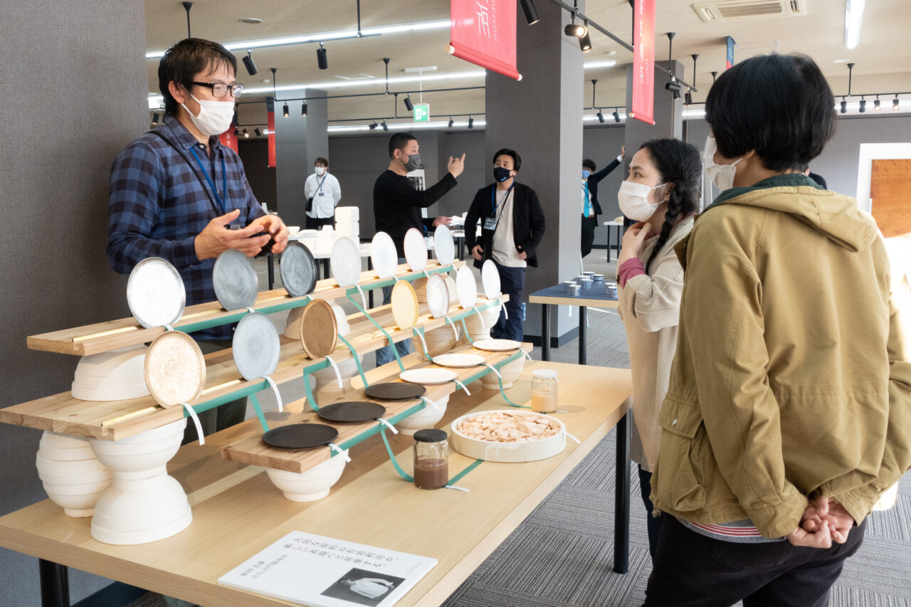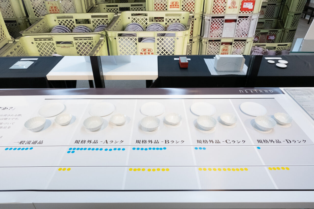 有田焼業界では、鉄粉やピンホールによって規格外と判断され、廃棄されたり安価で販売されたりしている商品はいまだに多い。昨年のSDGs(持続可能な開発目標)に関する展示は「本当に小さな鉄粉一つでも良品として認識いただくことはできないのだろうか」という疑問から生まれた実験的なものであったが、今回はもう一歩踏み込み、「どの程度までなら許容できるか」という問いを投げかけるものとなっていた。規格外品にもランクがあり、良品に近いものから順にAからDにカテゴライズされる。そこで、来場者が産地の現状を伝えるパネル展示を見る前後で、許容範囲と感じるランクに変化が生じるかどうかを調査したところ、展示を見る前はAの回答が最も多く、展示を見た後ではCが最も多いという結果が出た。産地の現状を知ることで、人々の規格外品に対する許容範囲が拡大したことがわかる。