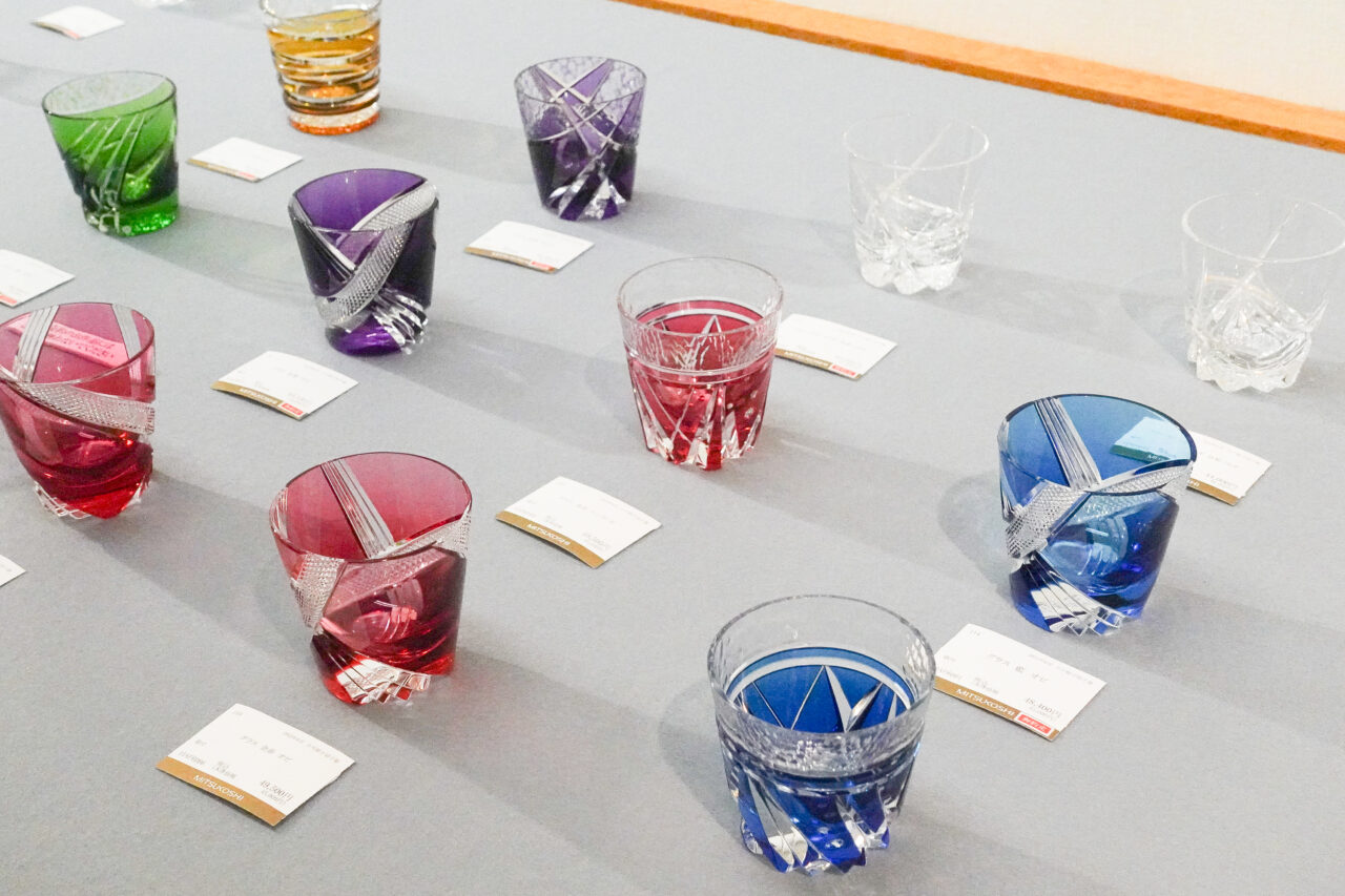生地にさまざまな色ガラスを取り入れていることも、小川さんの作品の特徴の一つ。落ち着いた色彩の「青緑」や「藍」は生活空間との相性が良く、小川さんが好んで使用する色である。濃い青が特徴の「瑠璃」は、「金赤」とともに江戸切子の伝統色とされ、その鮮やかさにはなんともいえない高級感がある。ほかにも「金紫」「黒」「オパール」「アンバー」といった色とりどりのガラスがあり、鑑賞者の目を涼やかに楽しませてくれた。