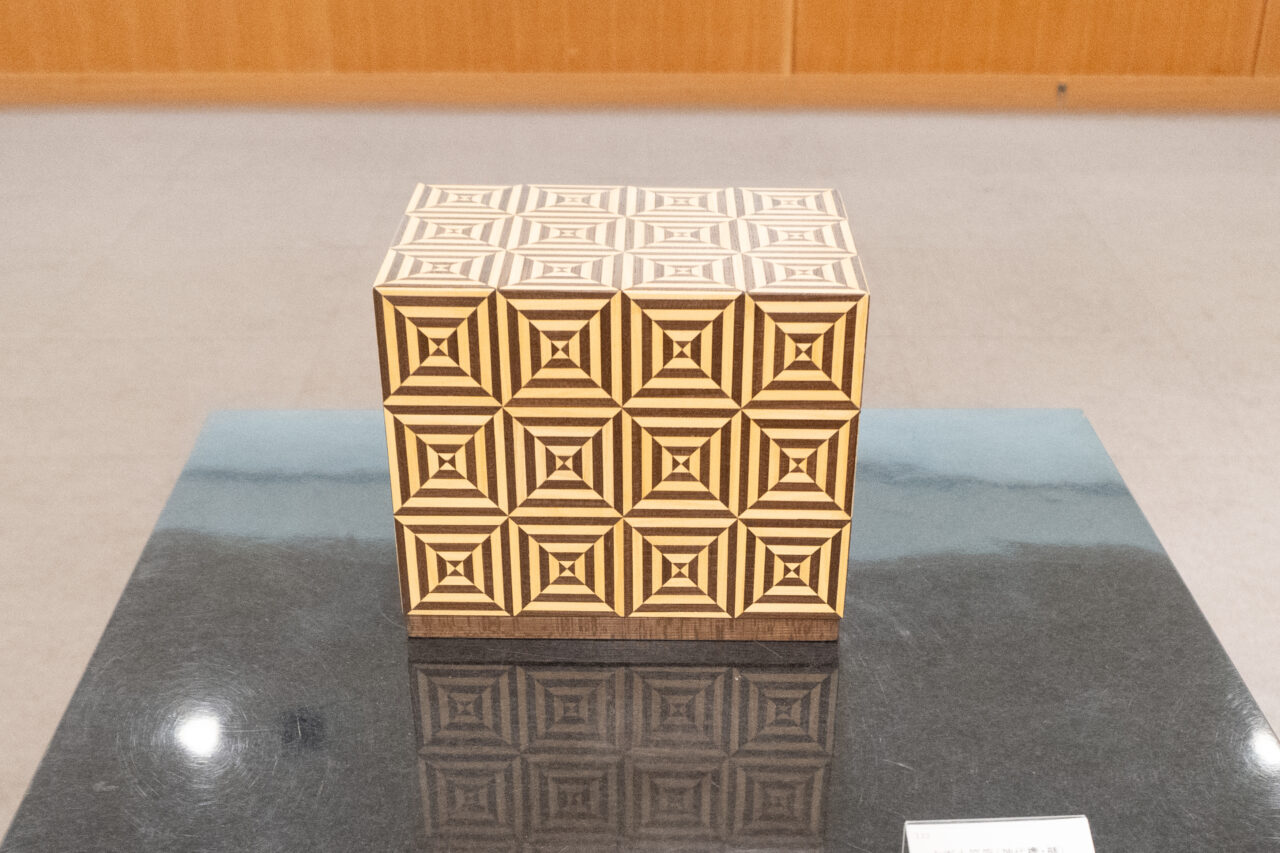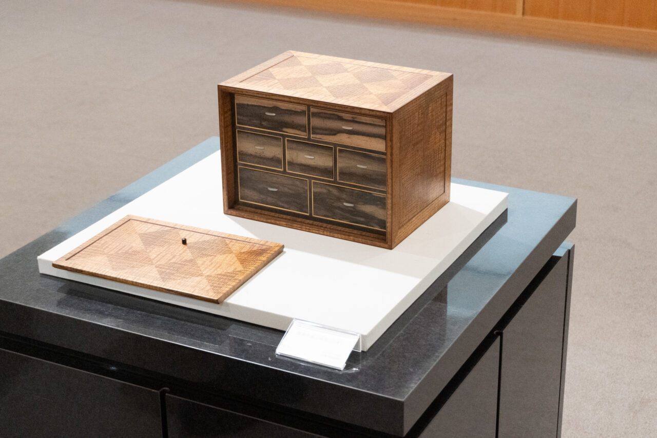 佃さんは木という材料を自在に使いこなしつつ、木の多様な魅力を示そうと試みる。例えば《黄肌木画小箪笥(キハダ)》は、引き出しの正面部分は黒柿、引き出しの縁の部分は柘植、箪笥全体の縁の部分は椿を使っている。この作品は、正面から見ると、まるで水墨画のような黒柿の模様が目を惹き、上から見ると、精緻な図形と文様が幾何学的で硬質な印象を与える。一方、黒や薄茶の木を組み合わせた《木画小箪笥(神代欅・榧)》は、木の色味と照りが相まって遠近感が生じ、まるで騙し絵のような効果を生んでいる。
