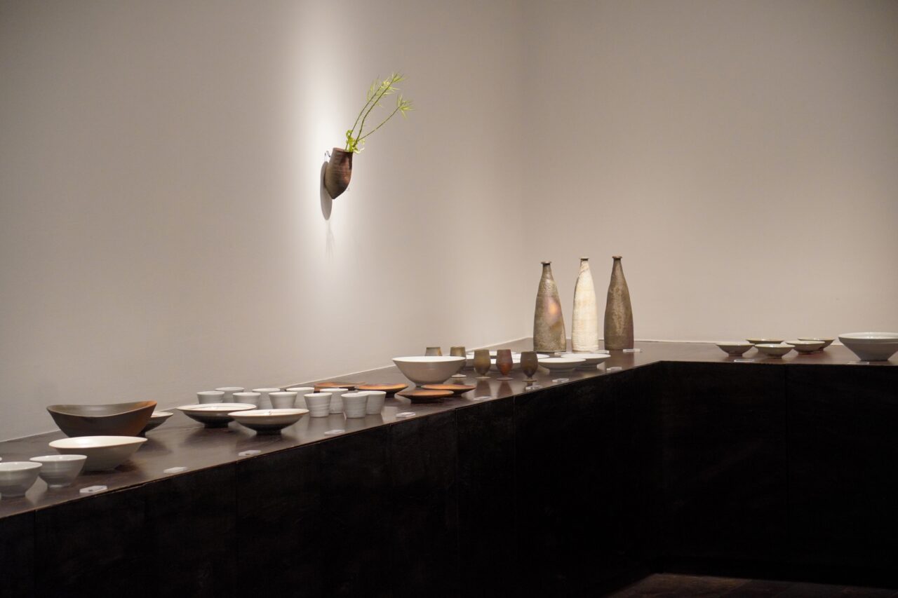 ギャラリーの広い空間を見渡すと、とりわけ花器が目を惹いた。それはおそらく、土の繊細な質感や複雑な色味が、植物の生命力を魅力的に見せていたからだろう。器のシンプルでおおらかな雰囲気は、活けた花を品良く引き立たせながら、どんな場にも馴染むように感じられた。