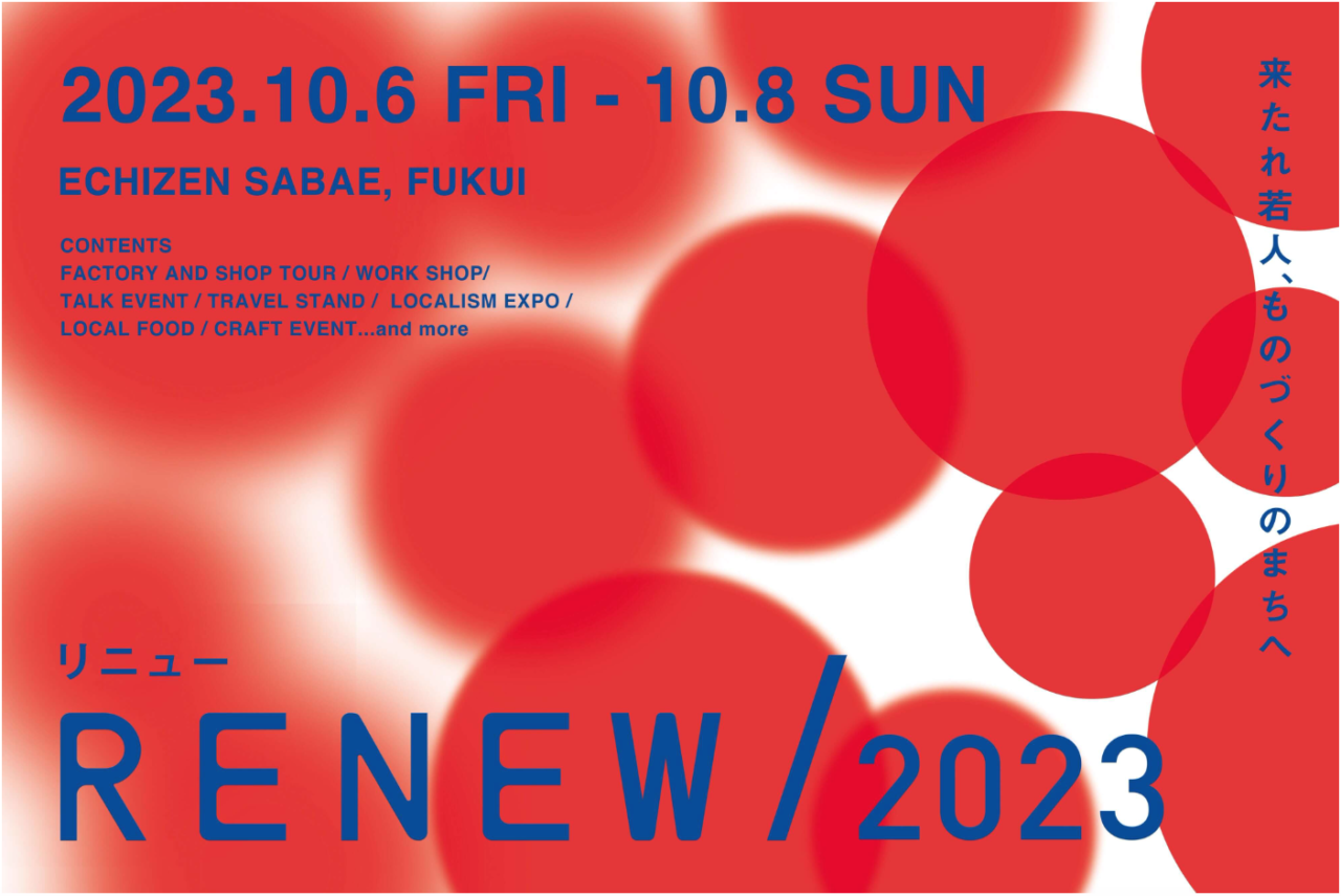 持続可能な地域づくりを目指した産業観光見学イベント『RENEW(リニュー)』が2023年10月6日(金)から8日(日)の日程で開催される。開催場所となる福井県越前鯖江エリアは、越前漆器・越前和紙・越前打刃物・越前箪笥・越前焼などの伝統工芸品や眼鏡・繊維といった地場産業が半径10km圏内に集まり、技術を継承しながら時代に合わせたものづくりを続けている地域。最近は担い手として外部から移り住む若者も増えているという。昨年はコロナ禍前の活気が戻り、来場者数は延べ3万7千人を記録した。9回目の開催となる今年は工房・飲食店・宿泊施設などの地域企業、94社の参加が予定されている。