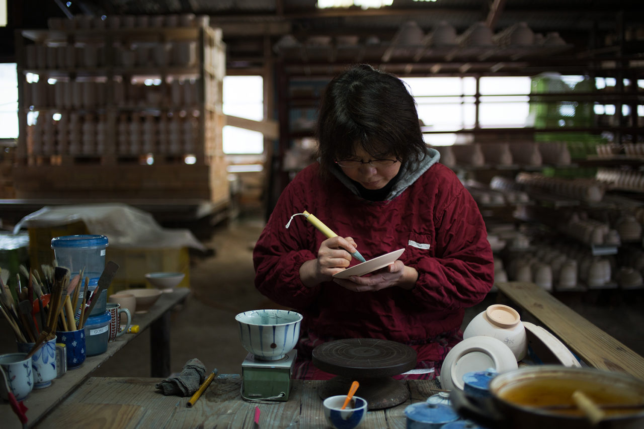 美智子さんが、器に濃み筆で丁寧に色を塗り重ねる姿は、凛として美しい。世界に向けて「副久GOSU」が飛び立つ日は近い。きっと世界は、この五種の色に驚くだろう。
