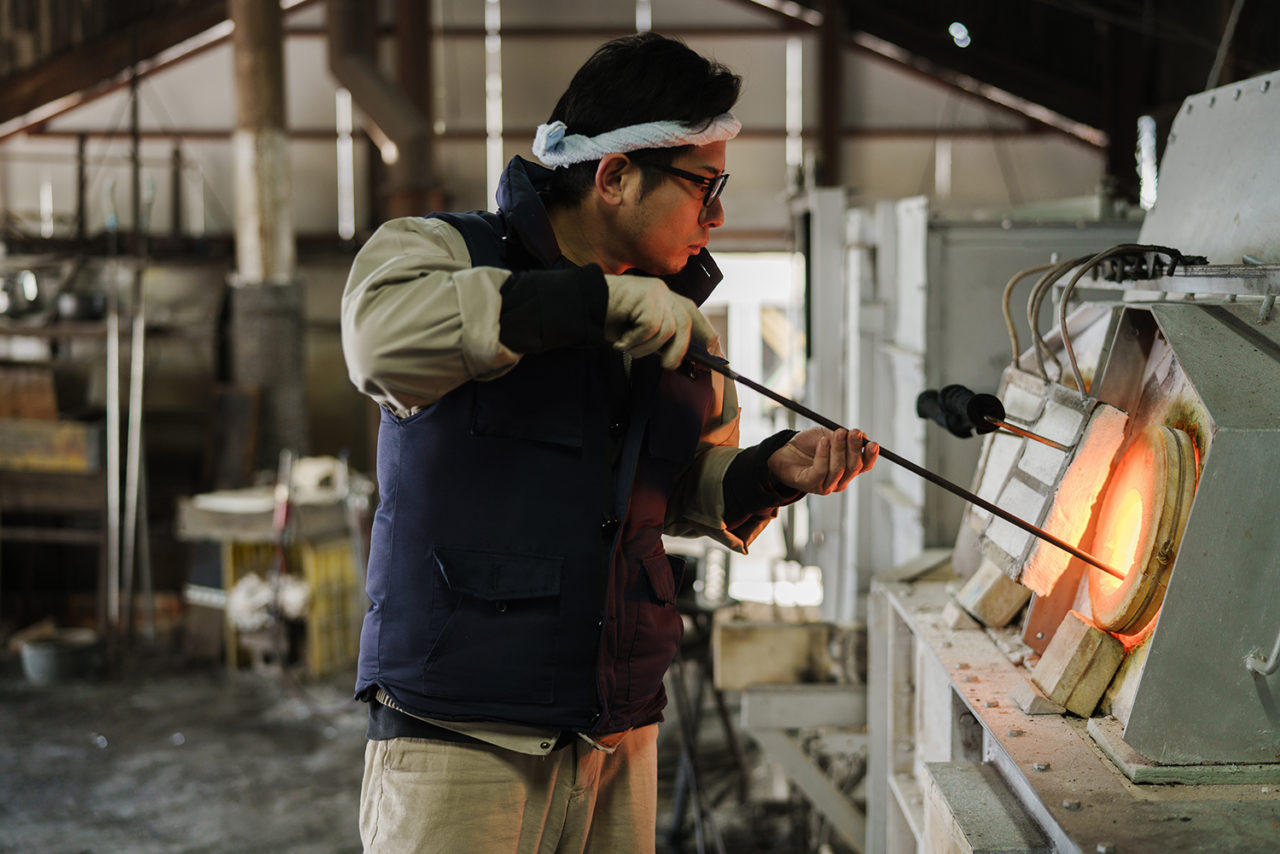 副島硝子工業の次代を担う職人である、副島正稚さん。副島さんは「肥前びーどろ」と呼ばれる、佐賀県地方特有の型を用いない宙吹き硝子を得意とする。大学で硝子を学び、入社してからは父や先輩たちの背中を見ながら技法を学んできた。