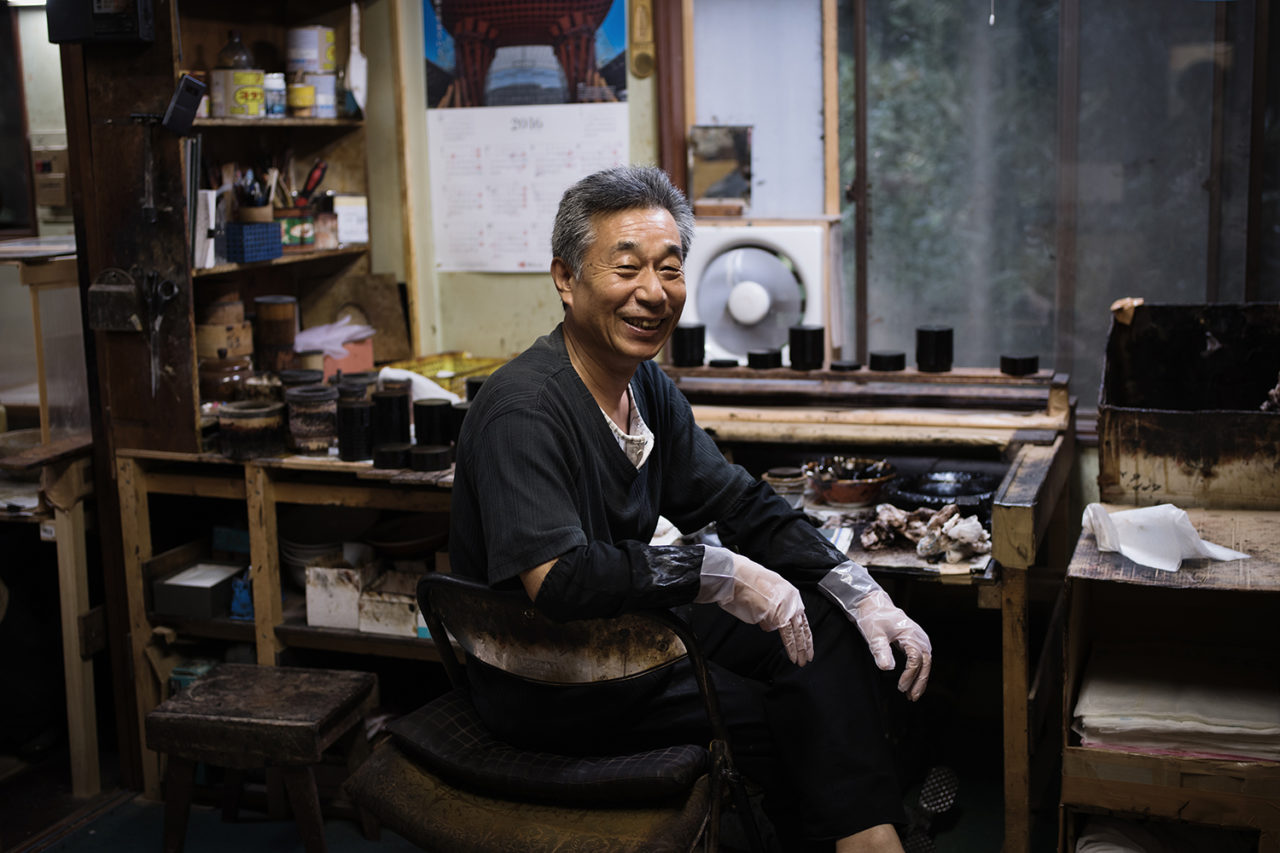 拭漆職人の我戸宣夫さんは、我戸幹男商店の三代目。父であり二代目の幹男さんの「漆器はなくならん」という言葉に後押しされ、家業を継ぐことを決意した。