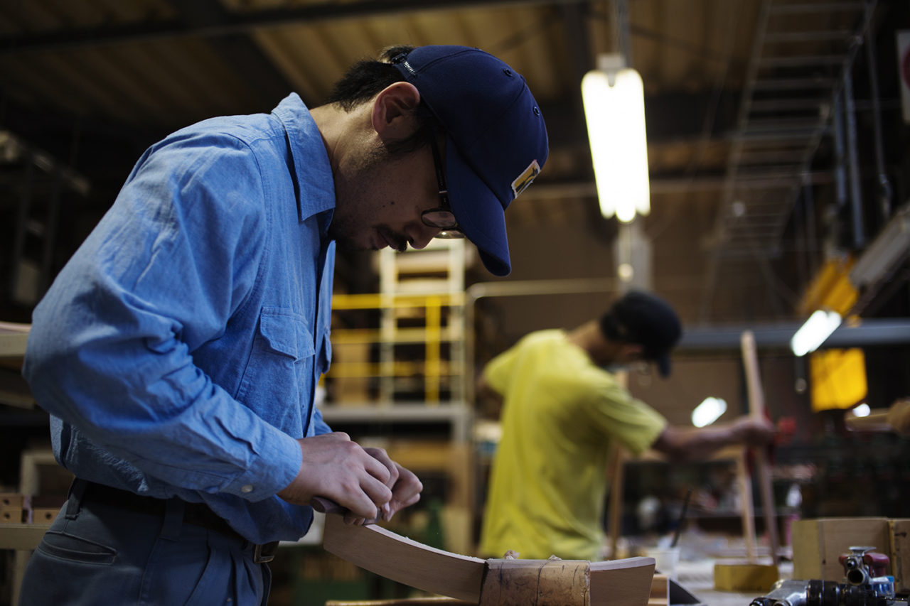 卒業後は、工業デザインを学び、アンティーク家具の修理や椅子張りの職を経た後、2009年、岐阜県の飛騨産業に入社。特注品の製造現場を担当して数年後、念願の製品開発部へ。新製品の試作・開発に従事し、同社の特殊技術である、杉の圧縮材を用いた家具の開発にも携わった。顧客と直接話す機会の少ない製品開発の現場は、想像力が欠かせない。