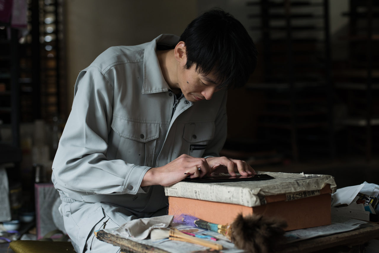野村さんの経歴は、職人とは縁遠いものだったが、2010年に天野漆器に転職。漆塗り職人となった。未経験から技術習得を後押ししてくれる環境で、元来手先が器用だった野村さんの能力が開花した。野村さんの仕事は主に、「貝むき」と呼ばれる「青貝塗り」の製作工程の一つである。貝を覆うように塗られた漆を貝の図柄に沿って剥がす作業は、細心の注意が必要だが、緊張の先に喜びがある。