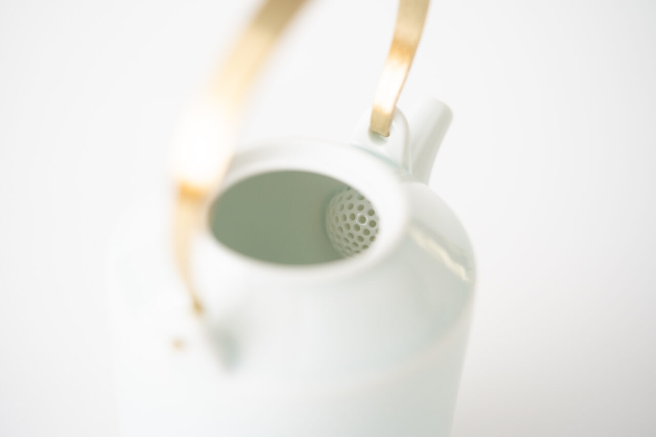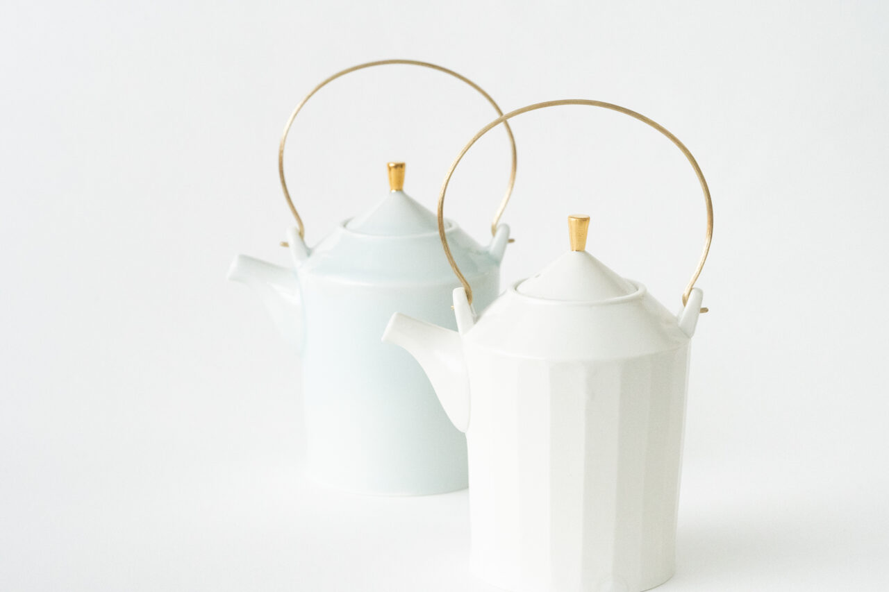 《聞香器 BUN KO KI》は、アルファベットの “U” と “I” の形を模したカップが特徴で、2つのカップ(U=あなた、I=私)でお茶の香りを楽しむことをコンセプトに掲げる。カラーは白磁と青白磁の2色展開。それぞれ無地の「無垢 白瓷」「無垢 青白磁」、鎬のデザインが施された「鎬 白瓷」「鎬 青白磁」が揃う。白瓷の釉薬には、素焼き生地の破損品を再利用したものが素材として使用され、環境への配慮も忘れない。柔らかな釉調や質感に、これまでの藤巻製陶の白磁とは一味違った魅力も生まれている。