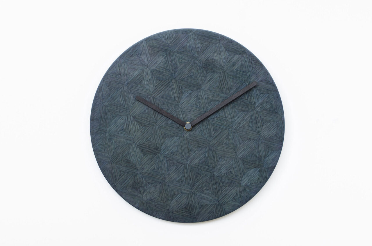 森工芸では、木の種類も世界中から多く取り揃えている。《CLOCK》は木の栄養分を送る放射組織、斑(ふ)が木目とは別に入ることで独特な光沢を持つ「ナラ」と、徳島県産の蓼藍を用い、発酵建てという方法で藍染を施した「藍染」の2色展開。時計の針部分の表面材にも黒檀突板を使用している。《STAND》では「ナラ」と「藍染」のほかに、木目の美しさから世界三大銘木の一つとされる「ウォールナット」も採用している。