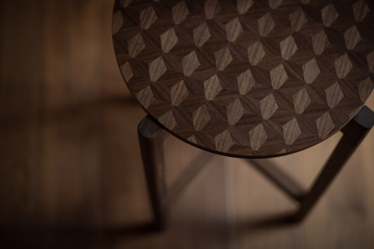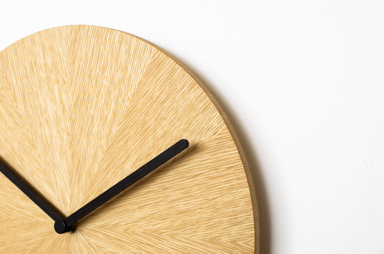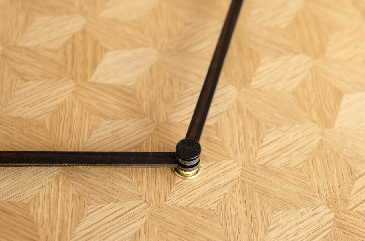 《CLOCK》と《STAND》双方とも、「Rays」と「Hoek」の2種類の模様から選択が可能。「Rays」は三角形に切りそろえた突板を放射状に貼り合わせることで、中心から光線を放っているように見えるデザイン。オランダ語で視点・角度の意味を持つ「Hoek」は、隙間なく木を嵌め込む「木象嵌」と呼ばれる技法で、変形六角形の突板を木目の向きを変えて幾何学的に組み合わせている。どちらも同じ樹種・色の木で構成されているが、光が当たる角度や見る方向で木の色が異なって見え、輝くような印象だ。
