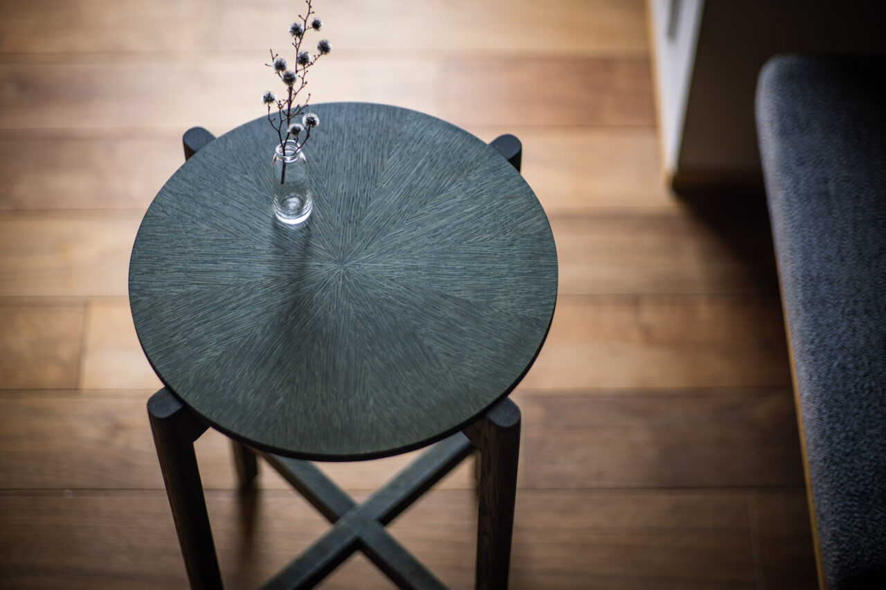 紙のように薄く削り出した木「突板」を貼る木材加工を専門としている森工芸。1953年に徳島県で創業して以来、培ってきた技術や木の知識を受け継ぎ、住宅の内装提案や木製家具・工芸品の製造販売を行なっている。自然の芸術である美しい木目を生かしながら、張り合わせや組み合わせ方を工夫した多様な意匠が特色だ。2020年にフランス パリの展示会「メゾン・エ・オブジェ」で発表し、好評を博したトレイ《RAYS TRAY》に続き、壁掛け時計《CLOCK》とサイドテーブル《STAND》が今年新たに発売されている。