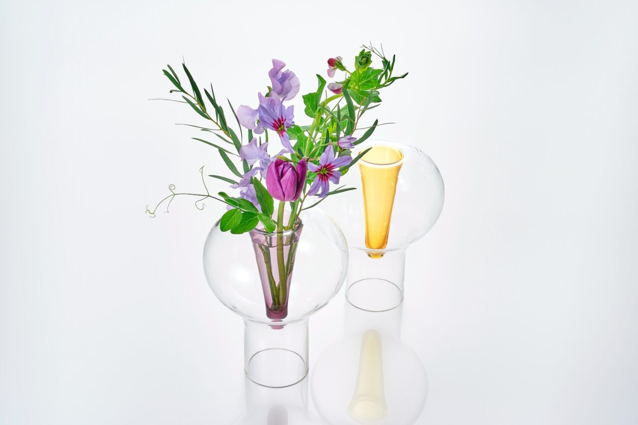 《aero(アエロ)》は色ガラスの部分が空中に浮いて見えるようなフラワーベース。職人同士の巧みな連携によって、型で吹いたクリアなガラスの上部から色ガラスを落として作られている。まるで風船に花を生けるような、空気を感じる花器だ。