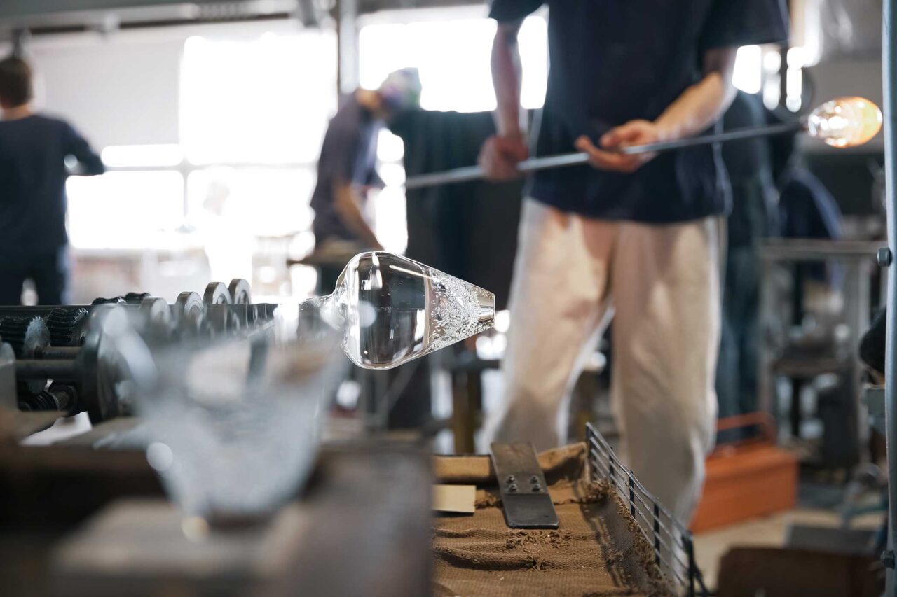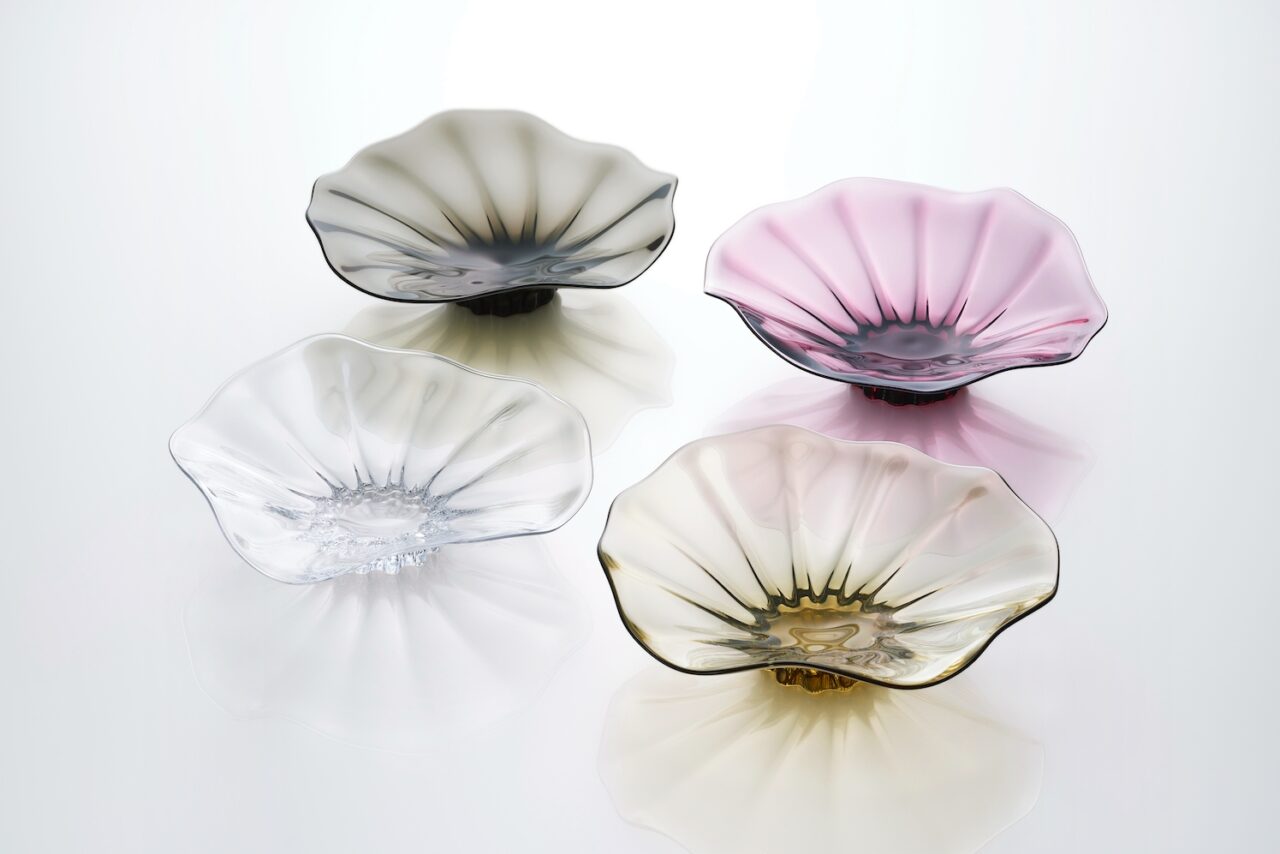 《flutter(フラッタ)》はピンブローという技法により、溶けたガラスを水蒸気で膨らませ、さらに遠心力で開き、重力で動きをつけて形作られている。ひらひらと軽やかな縁は薄く、底はしっかりと安定感がある。なるべく手を加えず、自然の力を形にした器だ。
