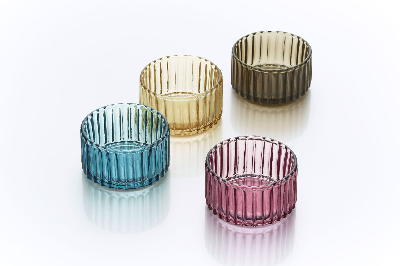 《coconisotte(ココニソット)》は小ぶりなサイズ感と、食べ物が掬いやすいよう低めに設定された高さが使いやすい実用的な器。小さな高台もありスタッキングも可能。陶芸で使われる鎬の技法をガラスで表現しており、鎬の深さとガラスの軽やかさが丁寧な調整によって実現している。
