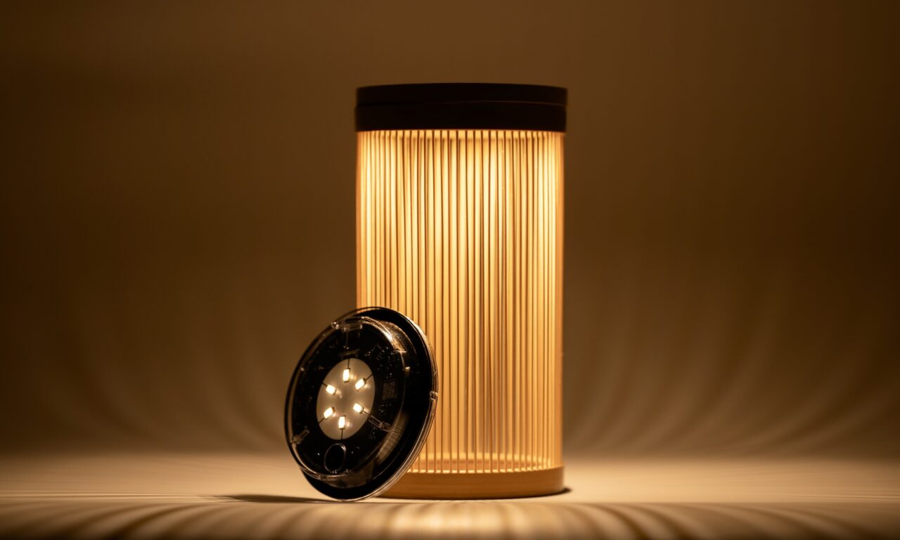 照明に搭載されているソーラー照明ユニット「Sonnenglas® SOMO」 は、ソネングラスが開発した次世代のソーラー照明モジュールで、南アフリカの自社工房にて、雇用と安定した労働環境の創出を目的としたフェアトレード体制のもと、全て手作業で生産されている。電気を一切使わず太陽光のみで充電ができ、一度の充電で最長100時間の点灯が可能。手のひらに収まるコンパクトなサイズで、防災やアウトドアでの使用にも適している。行燈シェードは、照明器具や茶道具、花器などの生活道具を製作する静岡県のみやび行燈製作所によるもので、伝統的な駿河竹千筋細工の技法によって、1mm程度の細い竹ひごを繊細な職人技で丁寧に編み上げて作られている。