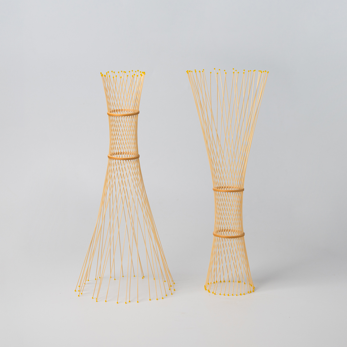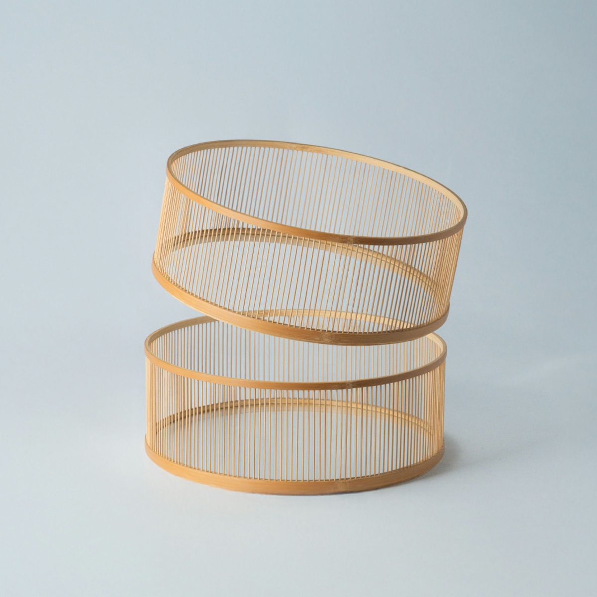 ポータブルテーブルランプの《千空》は、2025年のグッドデザイン賞を受賞。現代の生活に調和する洗練されたディテールや、光源の存在を感じさせずに駿河竹千筋細工の影をも美しく見せるLED照明技術が評価された。竹ひごが連なる優雅な形状から放たれる光が、静かな温もりを演出してくれる。花器とアロマディフューザーの《リネア》は、竹を内側に曲げる高度な技術によって、竹のしなやかな曲線美を最大限に引き出した、空間を彩る品。竹輪の円を縦にスライスしたようなデザインの花器《イレギュラー》は、壁に沿わせて使用した際に壁面に映る影も見どころ。《セントエン》は竹の線の連なりの美しさを感じる道具。開いたり閉じたりと、線を動かして楽しめる。繊細な竹ひごが縦に整列する《カラ》は、面の部分にガラスを用いた菓子器。ガラスを使用することで真円を保つことができ、蓋の収まりがよく積み重ねも容易だ。