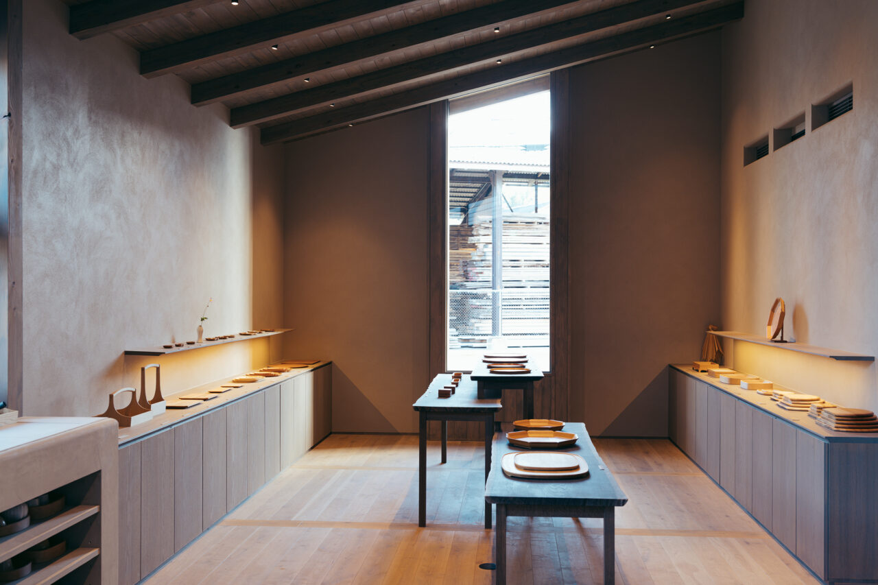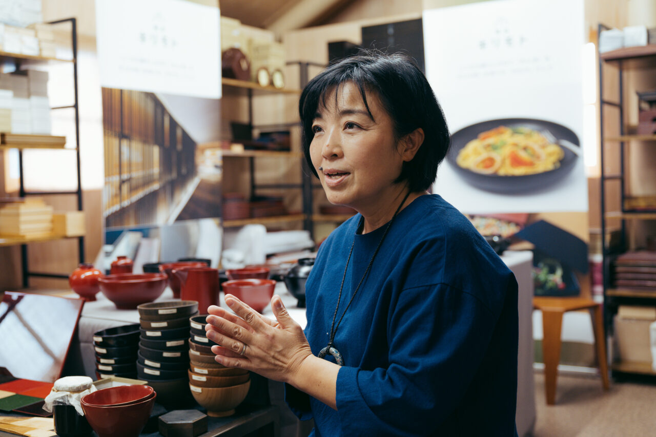 輪島市内へと到着し、まずは輪島キリモトの副代表である桐本順子さんにお話を伺った。輪島キリモトは、朴木地屋(ほおきじや)としての歴史を持ちながら、現在では漆器づくりも自社で行ない、輪島の漆器ブランドとしてお椀やカトラリーから大型の家具まで、多様な製品を生み出している。震災後、輪島キリモトには、全国から多くの支援の声が届き、いち早くオンラインストアを復旧。2月には、建築家の坂茂氏の協力のもと仮設工房を設立し、今では日本各地の展示にも積極的に参加をしている。桐本家の自宅は地震により全壊してしまったが、2022年に作られたショールームの建物は無事だったため、現在はそこで寝泊まりをしながら、仮設工房を漆器の展示場として活用している。ご自身たちの生活すらもままならない中、工房で働く職人たちの声に耳を傾けながら、日々どうしていくべきかを考え続けている様子だ。順子さんは震災後、陶磁器やガラスの器が数多く割れてしまった中で、漆器が割れずに残ったことに強く心を打たれたという。欠けても修復ができ、布で磨けばすぐに輝きを取り戻してくれる。以前に友人から、疲れたときに漆器のお椀で温かいものを食べると元気が出るという言葉をもらったことも思い出し、自分たちの漆器はこんなにも頼もしいものだったのだと思い直したそうだ。順子さんがそんなお話をしながら、漆器のお椀を優しく手に持つ姿が、とても印象的であった。