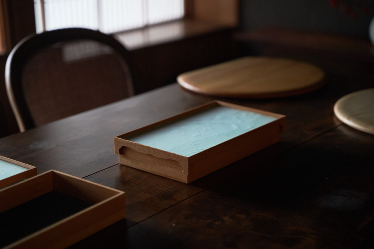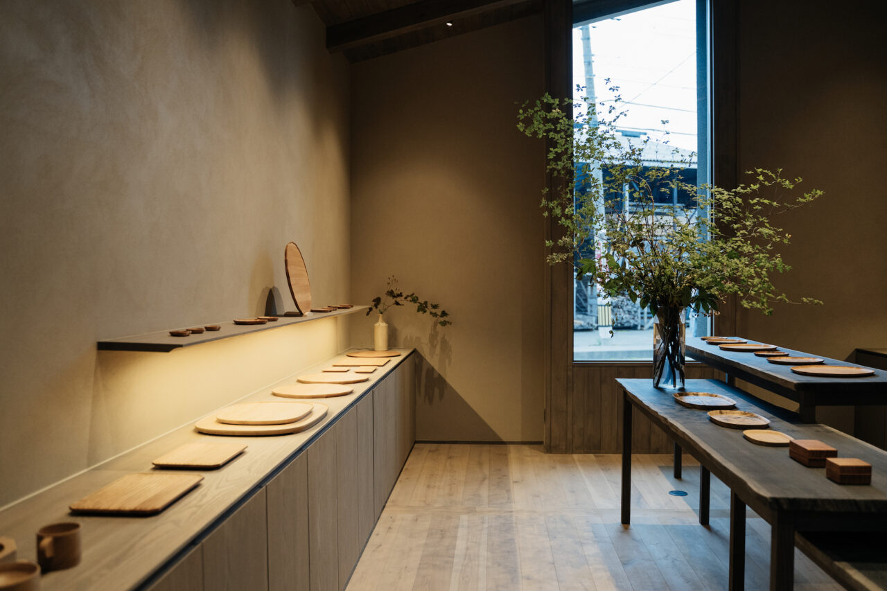 この秋、約1年の建築期間を経て、工房の隣に「四十沢木材工芸 Factory’s Gallery」がオープンした。元は倉庫が建っていた敷地を生かした新築で、設計とインテリアは、富山県南砺市井波にて工芸と宿を結ぶ事業運営でも活躍している建築家、コラレアルチザンジャパンの山川智嗣氏が担当。以前から建築設計にとどまらず街づくりにも関わる氏の活動に注目していたことから、今回の依頼に繋がったという。建物の看板、各部屋の扉の手掛けやテーブルは四十沢木材工芸のプロダクトデザイン・ディレクションを以前から行なっている手工業デザイナーの大治将典氏のデザイン。設計、建築、施工と、富山と輪島から多くの人が携わって完成した空間は、製品と同様、木そのものの魅力にあふれている。