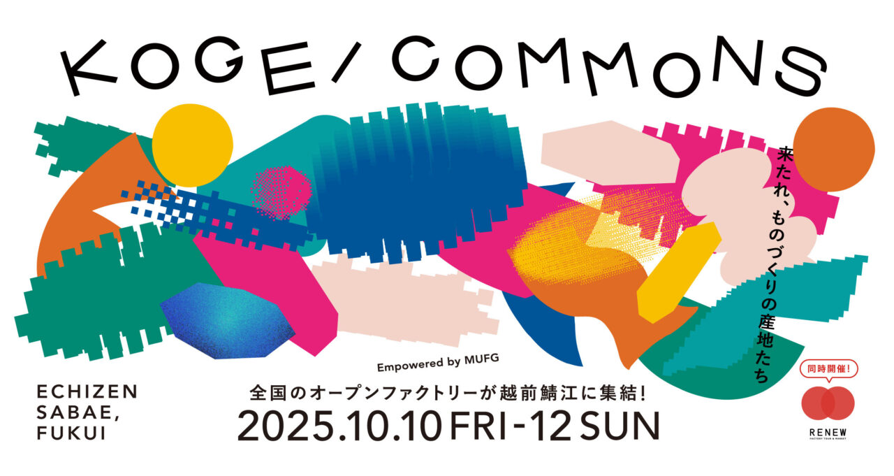 株式会社三菱UFJフィナンシャル・グループ(以下、MUFG)が展開する社会貢献活動「MUFG工芸プロジェクト」の一環として、2025年9月、「KOGEI COMMONS」が発足した。KOGEI COMMONSは、MUFGと一般社団法人関西イノベーションセンター、そして福井県鯖江市・越前市・越前町のオープンファクトリーイベント「RENEW」を運営する一般社団法人SOEの三者が協働し立ち上げたプロジェクトで、全国各地のオープンファクトリー団体間の交流や連携を通じて、それぞれの地域が持つ工芸の課題や知見を共有し、新たな展開を生み出す「学び合いの場」を築いていく。MUFGによる中長期的な支援活動のひとつとして、工芸を切り口とした地方創生の仕組みをつくり、ものづくりの未来を共に創造していくことを目的としている。
