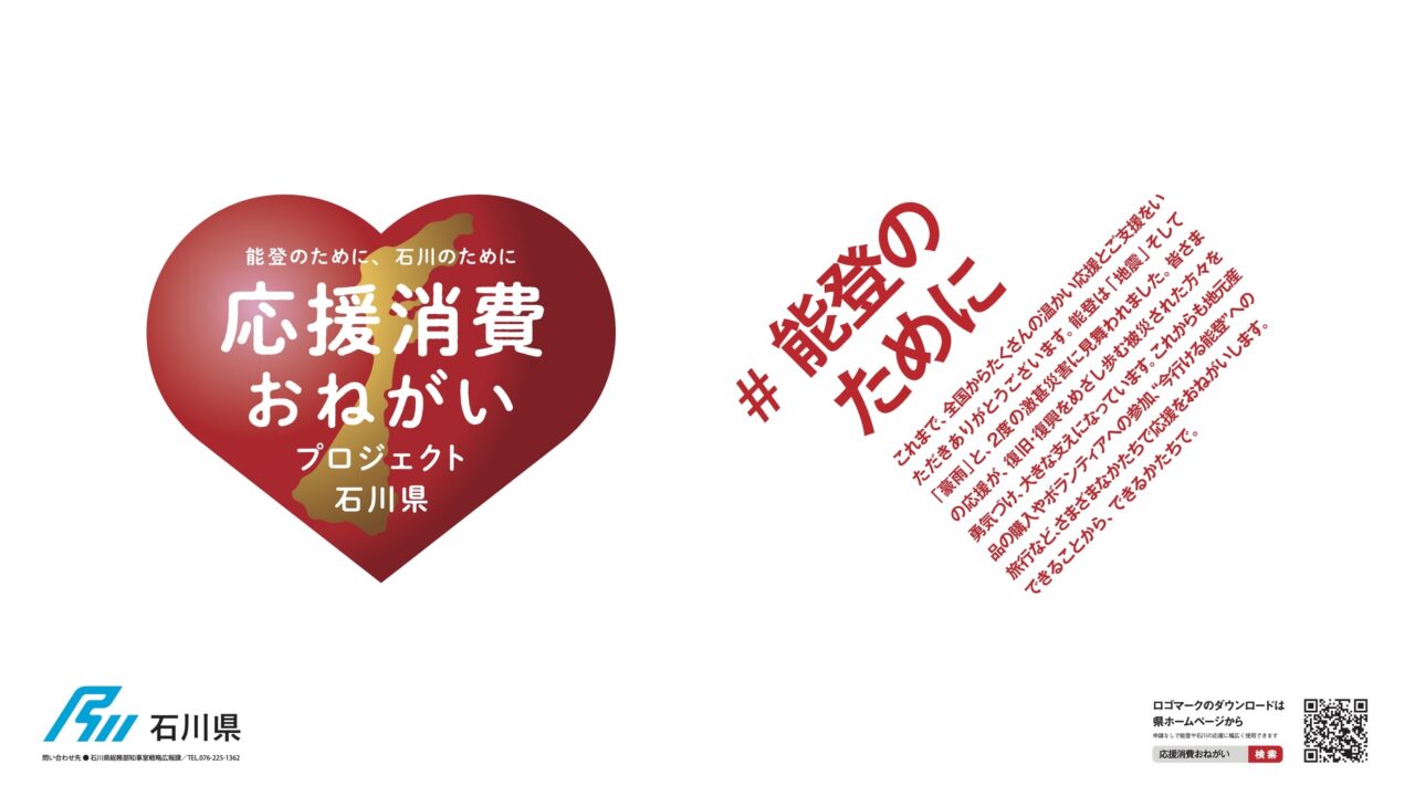 2024年に発生した能登半島地震と奥能登豪雨により甚大な被害を受けた能登半島。経済的な損失も大きく、能登地域以外に金沢以南でも、飲食、観光、伝統的工芸品など県産品の製造・販売を行なう事業者の売り上げが大幅に減少した。石川県では、ロゴマークを活用した応援消費喚起キャンペーン「能登のために、石川のために 応援消費おねがいプロジェクト」を実施し、県外・国外から来訪者を呼び込み、直接またはオンラインでの復興につながる消費拡大を呼びかけている。