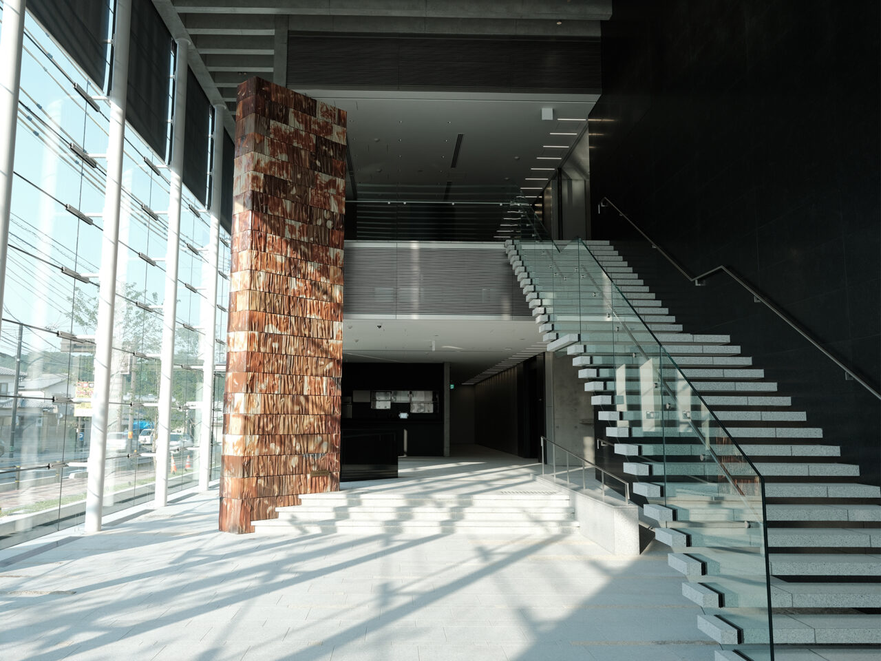 建物の設計を手掛けたのは、建築家の櫻井潔。土と炎の力で美しさを表現する備前焼とも通じる「素の美」をテーマに設計した。階段や床材に瀬戸内の自然石を使用するなど素材そのものの美しさを生かし、モノトーンを基調とした空間にまとめることで、凛とした雰囲気を創り出している。エントランス中央では、人間国宝の伊勢﨑淳が制作した備前焼の巨大モニュメント《土と炎の記憶》が出迎えてくれる。圧倒的な存在感が来館者を包み込み、これから出会う作品たちとの豊かな時間を予感させてくれる。