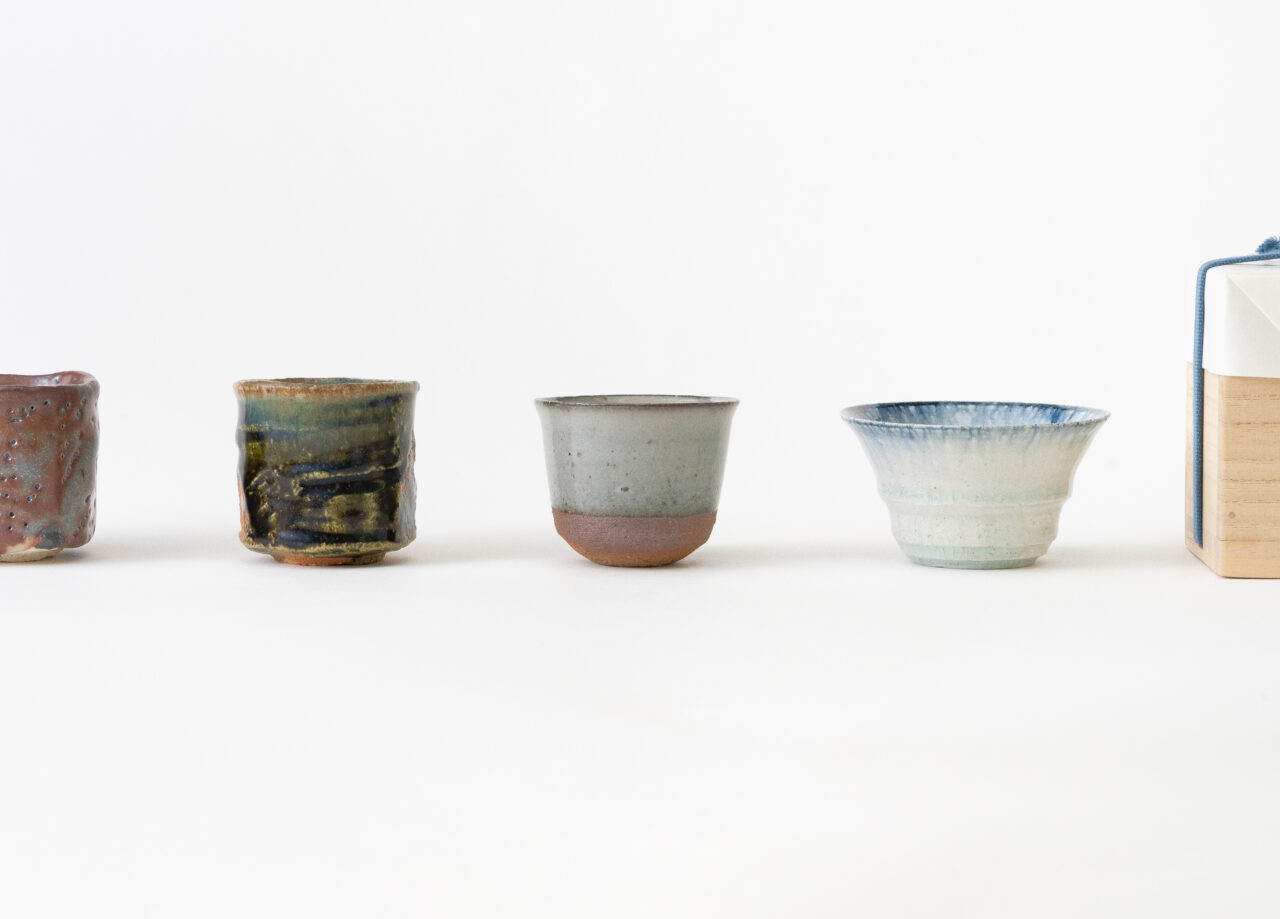 岐阜県の多治見にある伝統的な窯元「幸兵衛窯」の八代目であり、陶芸家としても活躍する加藤亮太郎。手がける酒器作品は、「志野」「織部」など、すべて美濃や瀬戸の地に根づくものだ。志野は穴窯でじっくりと焼成され、もっちりとした器肌が美しい。茜志野、鼠志野、小倉志野といった多彩な種類を操る豊かな表現力も、注目したい点のひとつ。織部は、お酒を注ぐと見込みの表情が煌びやかに変化し、その景色に魅了される。